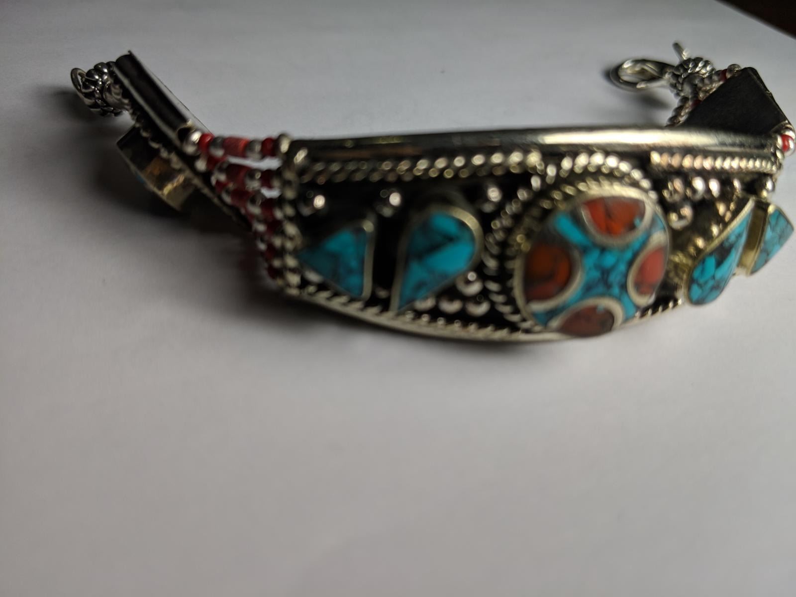 Tibet Natural Stone Hand Made Turquoise, Coral Bracelet.......This elegant large Bracelet was handcrafted in Tibet, the home of exquisite jewelry craftsmanship. It was skillfully made with natural Turquoise, each in a deep Tibetan Silver setting. and balance the design perfectly. Turquoise is used virtually worldwide for jewelry making, and is highly prized for its brilliant colors, which vary from mine to mine. The distinctive webbing patterns and variations of color in the stones on this wonderful piece are typical of the natural Turquoise found throughout much of the Himalayan region, where Turquoise has been used in jewelry-making since centuries.”””Note- All stones in this Bracelet are Natural.....Guaranteed....Vintage look but Bracelet is brand new.