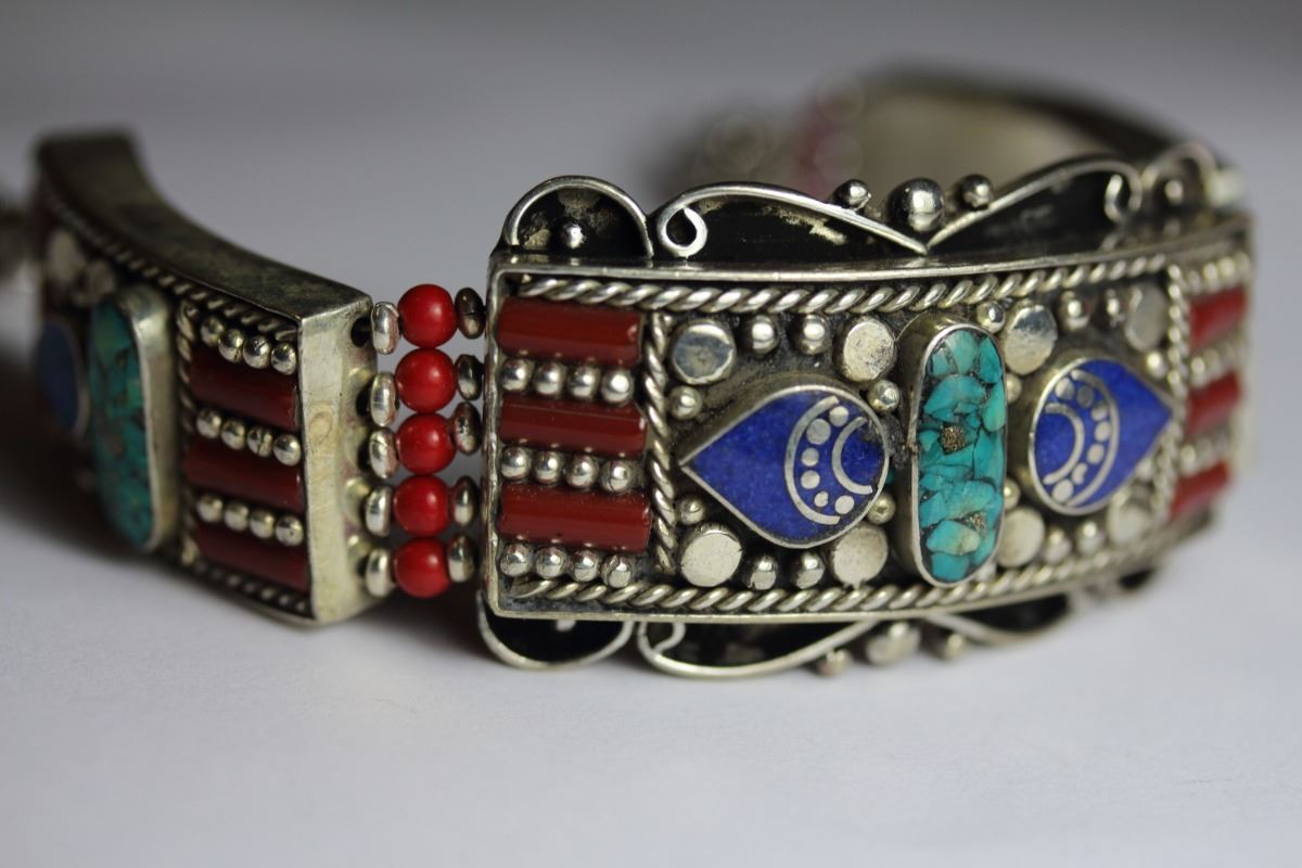ibet Natural Stone Hand Made Turquoise, Coral & Lapis Lazuli Bracelet.......This elegant large Bracelet was handcrafted in Tibet, the home of exquisite jewelry craftsmanship. It was skillfully made with natural Turquoise, each in a deep Tibetan Silver setting. and balance the design perfectly. Turquoise is used virtually worldwide for jewelry making, and is highly prized for its brilliant colors, which vary from mine to mine. The distinctive webbing patterns and variations of color in the stones on this wonderful piece are typical of the natural Turquoise found throughout much of the Himalayan region, where Turquoise has been used in jewelry-making since centuries.”””Note- All stones in this Bracelet are Natural.....Guranteed....Vintage look but Bracelet is brand new.