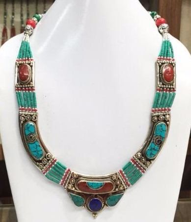 Tibet Natural Stone Hand Made Turquoise, Coral & Lapis Lazuli Necklace.......This elegant large Necklace was handcrafted in Tibet, the home of exquisite jewelry craftsmanship. It was skillfully made with large natural Turquoise, each in a deep Tibetan Silver setting. and balance the design perfectly. Turquoise is used virtually worldwide for jewelry making, and is highly prized for its brilliant colors, which vary from mine to mine. The distinctive webbing patterns and variations of color in the stones on this wonderful piece are typical of the natural Turquoise found throughout much of the Himalayan region, where Turquoise has been used in jewelry-making since centuries.”””Note- All stones in this necklace are Natural.....Guranteed....Vintage look but necklace is brand new.