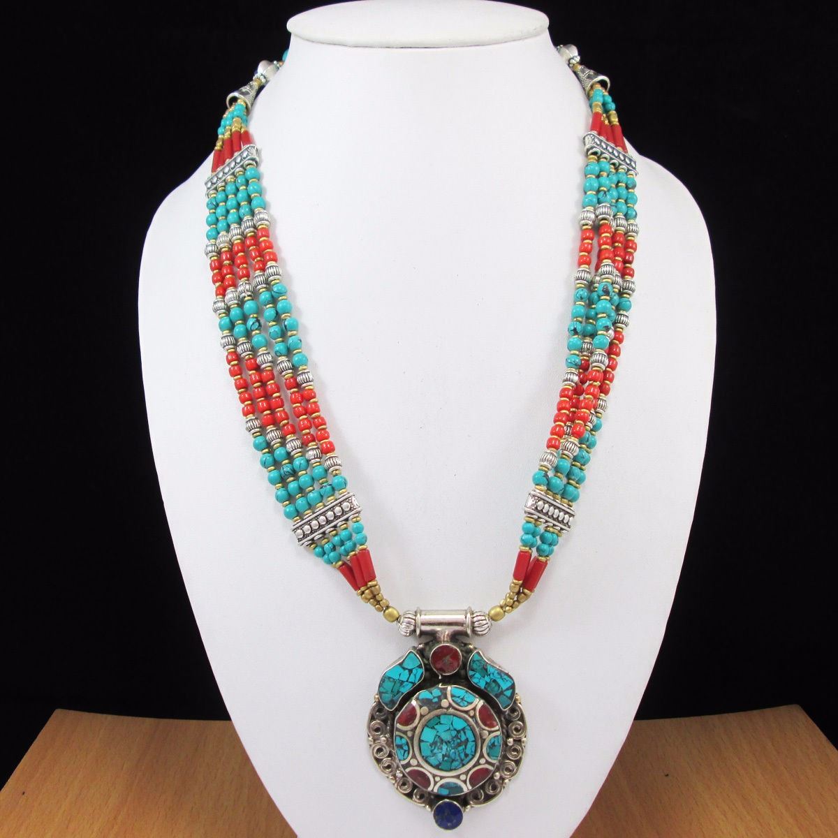 Tibet Natural Stone Hand Made Turquoise, Coral & Lapis Lazuli Necklace.......Length 18 inch;This elegant large Necklace was handcrafted in Tibet, the home of exquisite jewelry craftsmanship. It was skillfully made with large natural Turquoise, each in a deep Tibetan Silver setting. and balance the design perfectly. Turquoise is used virtually worldwide for jewelry making, and is highly prized for its brilliant colors, which vary from mine to mine. The distinctive webbing patterns and variations of color in the stones on this wonderful piece are typical of the natural Turquoise found throughout much of the Himalayan region, where Turquoise has been used in jewelry-making since centuries.”””Note- All stones in this necklace are Natural.....Guranteed....Vintage look but necklace is brand new.