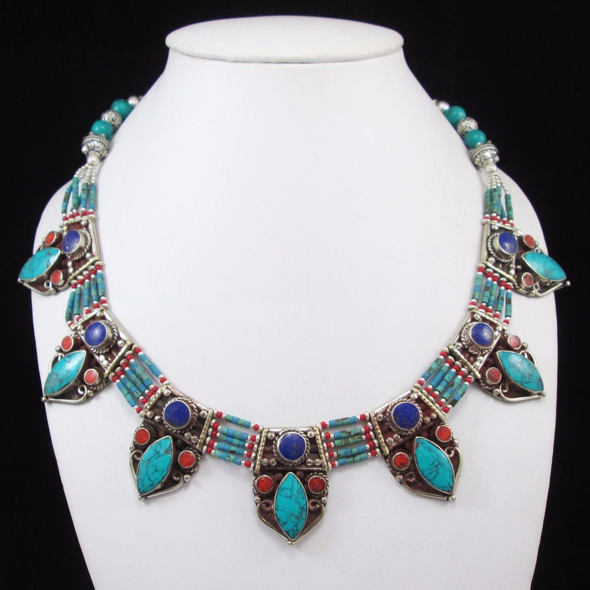 Tibet Natural Stone Hand Made Turquoise, Coral & Lapis Lazuli Necklace.......Length 18 inch;This elegant large Necklace was handcrafted in Tibet, the home of exquisite jewelry craftsmanship. It was skillfully made with large natural Turquoise, each in a deep Tibetan Silver setting. and balance the design perfectly. Turquoise is used virtually worldwide for jewelry making, and is highly prized for its brilliant colors, which vary from mine to mine. The distinctive webbing patterns and variations of color in the stones on this wonderful piece are typical of the natural Turquoise found throughout much of the Himalayan region, where Turquoise has been used in jewelry-making since centuries.”””Note- All stones in this necklace are Natural.....Guranteed....Vintage look but necklace is brand new.