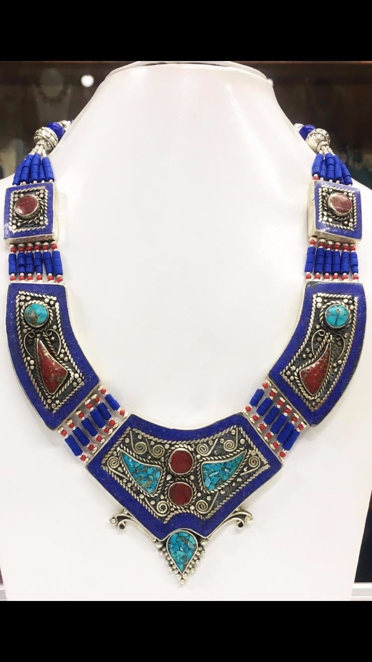 Tibet Natural Stone Hand Made Turquoise, Coral & Lapis Lazuli Necklace.......This elegant large Necklace was handcrafted in Tibet, the home of exquisite jewelry craftsmanship. It was skillfully made with large natural Turquoise, each in a deep Tibetan Silver setting. and balance the design perfectly. Turquoise is used virtually worldwide for jewelry making, and is highly prized for its brilliant colors, which vary from mine to mine. The distinctive webbing patterns and variations of color in the stones on this wonderful piece are typical of the natural Turquoise found throughout much of the Himalayan region, where Turquoise has been used in jewelry-making since centuries.”””Note- All stones in this necklace are Natural.....Guranteed....Vintage look but necklace is brand new.
