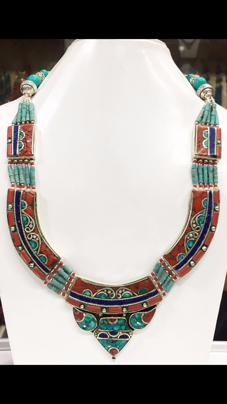 Tibet Natural Stone Hand Made Turquoise, Coral & Lapis Lazuli Necklace.......This elegant large Necklace was handcrafted in Tibet, the home of exquisite jewelry craftsmanship. It was skillfully made with large natural Turquoise, each in a deep Tibetan Silver setting. and balance the design perfectly. Turquoise is used virtually worldwide for jewelry making, and is highly prized for its brilliant colors, which vary from mine to mine. The distinctive webbing patterns and variations of color in the stones on this wonderful piece are typical of the natural Turquoise found throughout much of the Himalayan region, where Turquoise has been used in jewelry-making since centuries.”””Note- All stones in this necklace are Natural.....Guranteed....Vintage look but necklace is brand new.