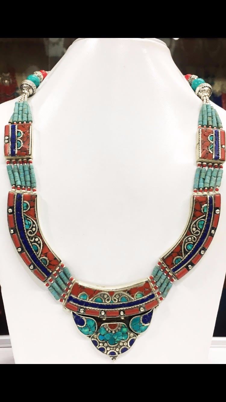 Tibet Natural Stone Hand Made Turquoise, Coral & Lapis Lazuli Necklace.......This elegant large Necklace was handcrafted in Tibet, the home of exquisite jewelry craftsmanship. It was skillfully made with large natural Turquoise, each in a deep Tibetan Silver setting. and balance the design perfectly. Turquoise is used virtually worldwide for jewelry making, and is highly prized for its brilliant colors, which vary from mine to mine. The distinctive webbing patterns and variations of color in the stones on this wonderful piece are typical of the natural Turquoise found throughout much of the Himalayan region, where Turquoise has been used in jewelry-making since centuries.”””Note- All stones in this necklace are Natural.....Guranteed....Vintage look but necklace is brand new.