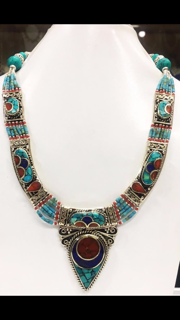 Tibet Natural Stone Hand Made Turquoise, Coral & Lapis Lazuli Necklace.......This elegant large Necklace was handcrafted in Tibet, the home of exquisite jewelry craftsmanship. It was skillfully made with large natural Turquoise, each in a deep Tibetan Silver setting. and balance the design perfectly. Turquoise is used virtually worldwide for jewelry making, and is highly prized for its brilliant colors, which vary from mine to mine. The distinctive webbing patterns and variations of color in the stones on this wonderful piece are typical of the natural Turquoise found throughout much of the Himalayan region, where Turquoise has been used in jewelry-making since centuries.”””Note- All stones in this necklace are Natural.....Guranteed....Vintage look but necklace is brand new.