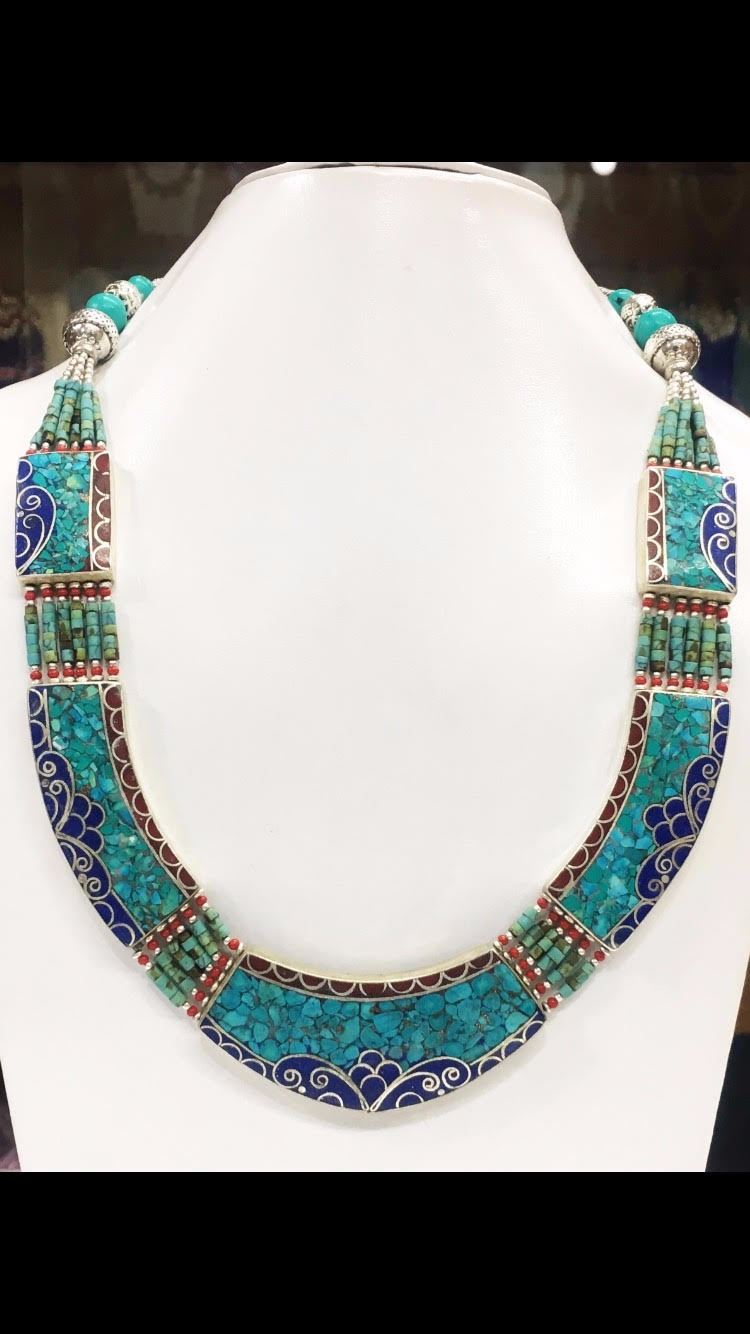 Tibet Natural Stone Hand Made Turquoise, Coral & Lapis Lazuli Necklace.......This elegant large Necklace was handcrafted in Tibet, the home of exquisite jewelry craftsmanship. It was skillfully made with large natural Turquoise, each in a deep Tibetan Silver setting. and balance the design perfectly. Turquoise is used virtually worldwide for jewelry making, and is highly prized for its brilliant colors, which vary from mine to mine. The distinctive webbing patterns and variations of color in the stones on this wonderful piece are typical of the natural Turquoise found throughout much of the Himalayan region, where Turquoise has been used in jewelry-making since centuries.”””Note- All stones in this necklace are Natural.....Guranteed....Vintage look but necklace is brand new.