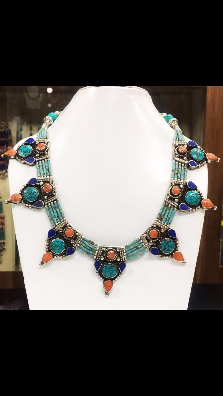 Tibet Natural Stone Hand Made Turquoise, Coral & Lapis Lazuli Necklace.......This elegant large Necklace was handcrafted in Tibet, the home of exquisite jewelry craftsmanship. It was skillfully made with large natural Turquoise, each in a deep Tibetan Silver setting. and balance the design perfectly. Turquoise is used virtually worldwide for jewelry making, and is highly prized for its brilliant colors, which vary from mine to mine. The distinctive webbing patterns and variations of color in the stones on this wonderful piece are typical of the natural Turquoise found throughout much of the Himalayan region, where Turquoise has been used in jewelry-making since centuries.”””Note- All stones in this necklace are Natural.....Guranteed....Vintage look but necklace is brand new.