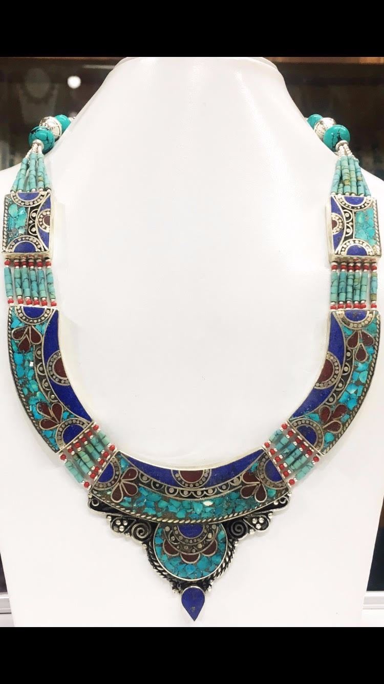 Tibet Natural Stone Hand Made Turquoise, Coral Lapis Lazuli Necklace.......This elegant large Necklace was handcrafted in Tibet, the home of exquisite jewelry craftsmanship. It was skillfully made with large natural Turquoise, each in a deep Tibetan Silver setting. and balance the design perfectly. Turquoise is used virtually worldwide for jewelry making, and is highly prized for its brilliant colors, which vary from mine to mine. The distinctive webbing patterns and variations of color in the stones on this wonderful piece are typical of the natural Turquoise found throughout much of the Himalayan region, where Turquoise has been used in jewelry-making since centuries.”””Note- All stones in this necklace are Natural.....Guranteed....Vintage look but necklace is brand new.