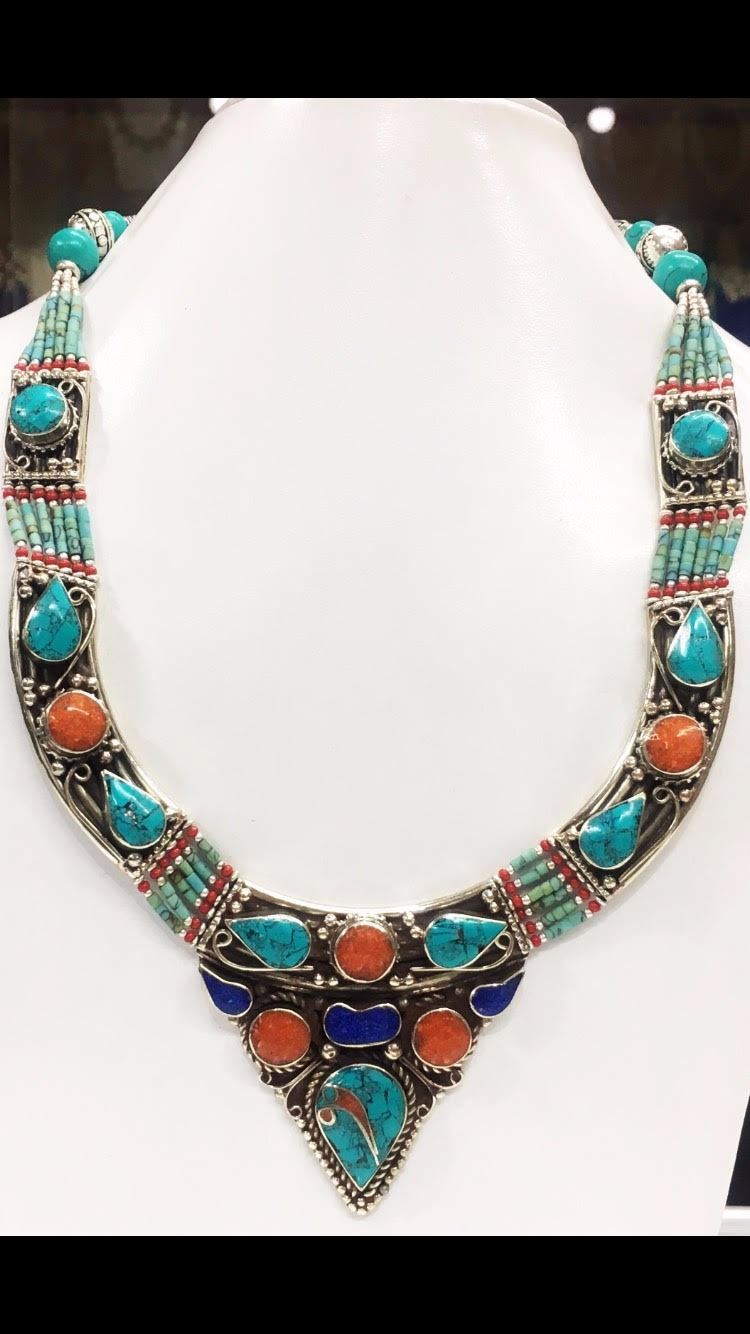 Tibet Natural Stone Hand Made Turquoise, Coral Lapis Lazuli Necklace.......This elegant large Necklace was handcrafted in Tibet, the home of exquisite jewelry craftsmanship. It was skillfully made with large natural Turquoise, each in a deep Tibetan Silver setting. and balance the design perfectly. Turquoise is used virtually worldwide for jewelry making, and is highly prized for its brilliant colors, which vary from mine to mine. The distinctive webbing patterns and variations of color in the stones on this wonderful piece are typical of the natural Turquoise found throughout much of the Himalayan region, where Turquoise has been used in jewelry-making since centuries.”””Note- All stones in this necklace are Natural.....Guranteed....Vintage look but necklace is brand new.