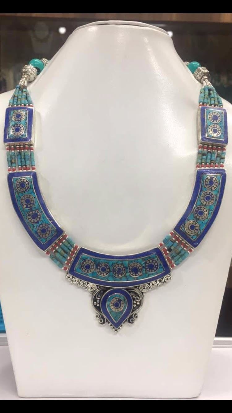 Tibet Natural Stone Hand Made Turquoise, Coral Lapis Lazuli Necklace.......This elegant large Necklace was handcrafted in Tibet, the home of exquisite jewelry craftsmanship. It was skillfully made with large natural Turquoise, each in a deep Tibetan Silver setting. and balance the design perfectly. Turquoise is used virtually worldwide for jewelry making, and is highly prized for its brilliant colors, which vary from mine to mine. The distinctive webbing patterns and variations of color in the stones on this wonderful piece are typical of the natural Turquoise found throughout much of the Himalayan region, where Turquoise has been used in jewelry-making since centuries.”””Note- All stones in this necklace are Natural.....Guranteed....Vintage look but necklace is brand new.