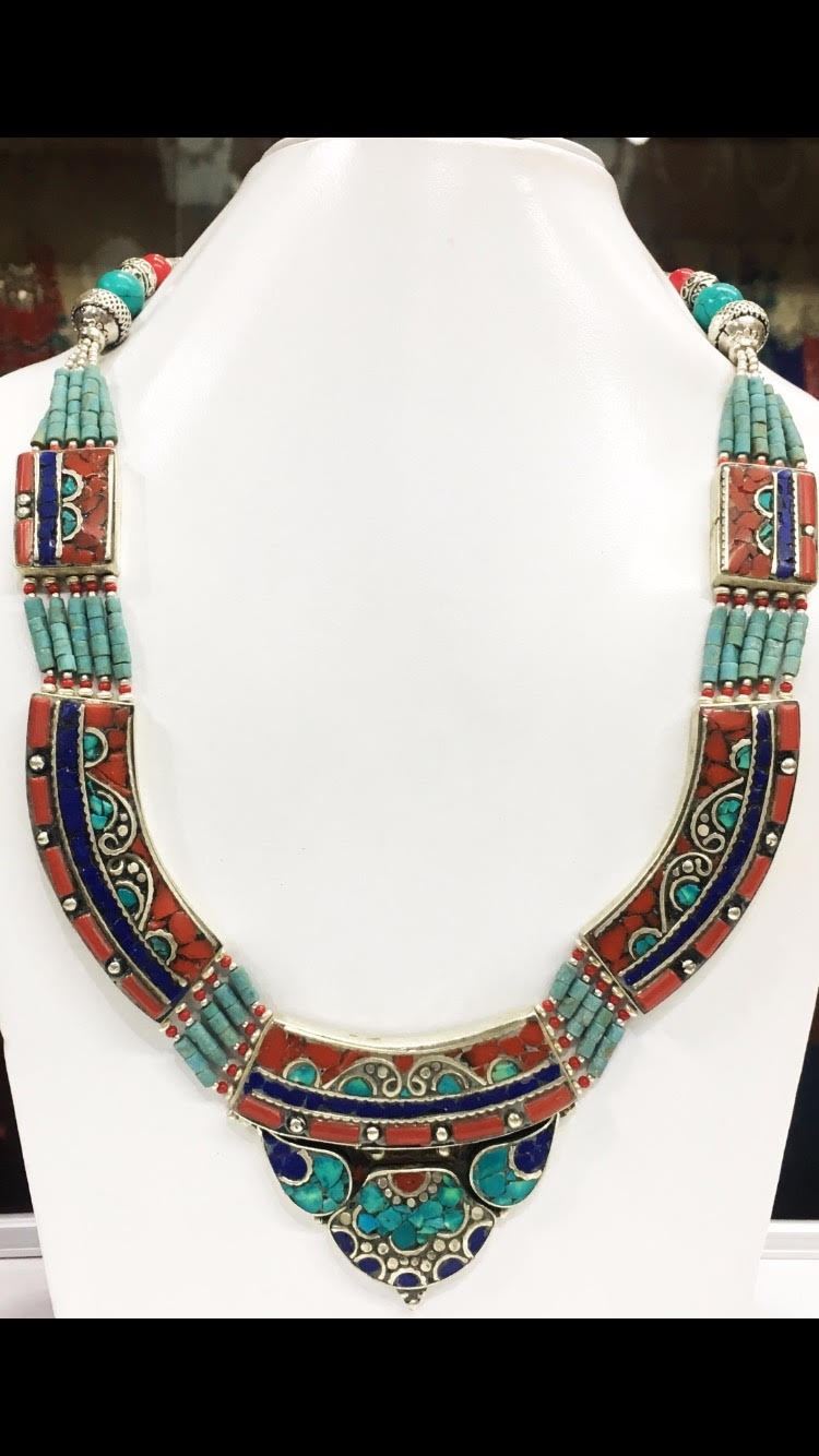 Tibet Natural Stone Hand Made Turquoise, Coral Lapis Lazuli Necklace.......This elegant large Necklace was handcrafted in Tibet, the home of exquisite jewelry craftsmanship. It was skillfully made with large natural Turquoise, each in a deep Tibetan Silver setting. and balance the design perfectly. Turquoise is used virtually worldwide for jewelry making, and is highly prized for its brilliant colors, which vary from mine to mine. The distinctive webbing patterns and variations of color in the stones on this wonderful piece are typical of the natural Turquoise found throughout much of the Himalayan region, where Turquoise has been used in jewelry-making since centuries.”””Note- All stones in this necklace are Natural.....Guranteed....Vintage look but necklace is brand new.