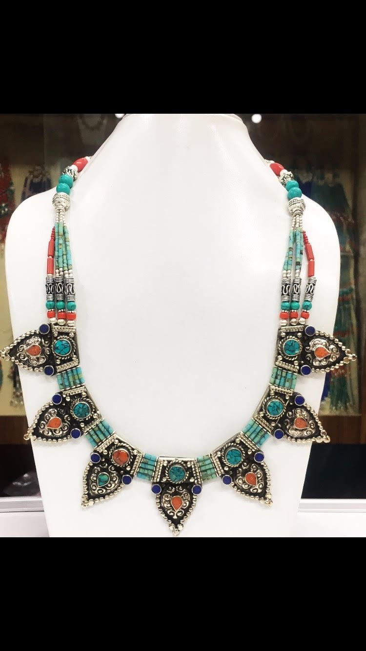 Tibet Natural Stone Hand Made Turquoise, Coral Lapis Lazuli Necklace.......This elegant large Necklace was handcrafted in Tibet, the home of exquisite jewelry craftsmanship. It was skillfully made with large natural Turquoise, each in a deep Tibetan Silver setting. and balance the design perfectly. Turquoise is used virtually worldwide for jewelry making, and is highly prized for its brilliant colors, which vary from mine to mine. The distinctive webbing patterns and variations of color in the stones on this wonderful piece are typical of the natural Turquoise found throughout much of the Himalayan region, where Turquoise has been used in jewelry-making since centuries.”””Note- All stones in this necklace are Natural.....Guranteed....Vintage look but necklace is brand new.