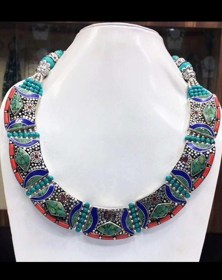 Tibet Natural Stone Hand Made Turquoise, Coral & Lapis Lazuli Necklace.......This elegant large Necklace was handcrafted in Tibet, the home of exquisite jewelry craftsmanship. It was skillfully made with large natural Turquoise, each in a deep Tibetan Silver setting. and balance the design perfectly. Turquoise is used virtually worldwide for jewelry making, and is highly prized for its brilliant colors, which vary from mine to mine. The distinctive webbing patterns and variations of color in the stones on this wonderful piece are typical of the natural Turquoise found throughout much of the Himalayan region, where Turquoise has been used in jewelry-making since centuries.”””Note- All stones in this necklace are Natural.....Guaranteed....Vintage look but necklace is brand new.