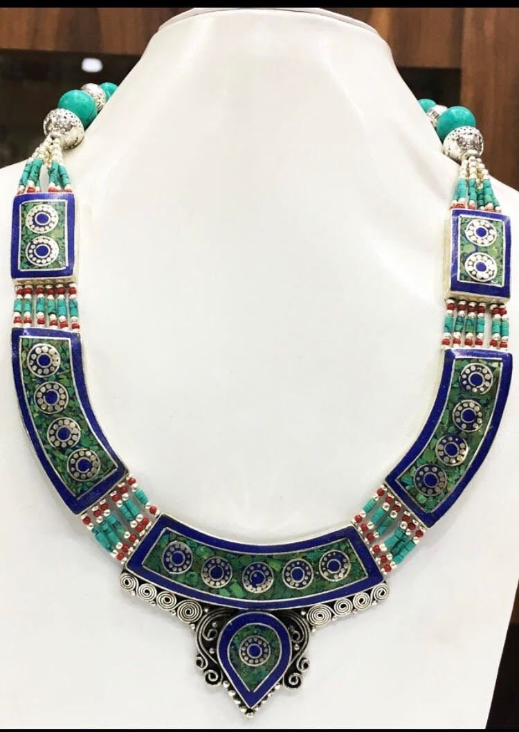 Tibet Natural Stone Hand Made Turquoise, Coral & Lapis Lazuli Necklace.......This elegant large Necklace was handcrafted in Tibet, the home of exquisite jewelry craftsmanship. It was skillfully made with large natural Turquoise, each in a deep Tibetan Silver setting. and balance the design perfectly. Turquoise is used virtually worldwide for jewelry making, and is highly prized for its brilliant colors, which vary from mine to mine. The distinctive webbing patterns and variations of color in the stones on this wonderful piece are typical of the natural Turquoise found throughout much of the Himalayan region, where Turquoise has been used in jewelry-making since centuries.”””Note- All stones in this necklace are Natural.....Guaranteed....Vintage look but necklace is brand new.