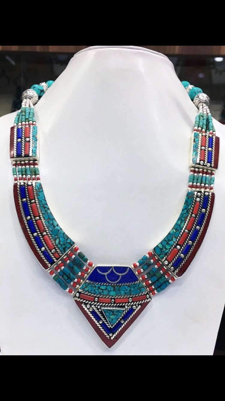Tibet Natural Stone Hand Made Turquoise, Coral & Lapis Lazuli Necklace.......This elegant large Necklace was handcrafted in Tibet, the home of exquisite jewelry craftsmanship. It was skillfully made with large natural Turquoise, each in a deep Tibetan Silver setting. and balance the design perfectly. Turquoise is used virtually worldwide for jewelry making, and is highly prized for its brilliant colors, which vary from mine to mine. The distinctive webbing patterns and variations of color in the stones on this wonderful piece are typical of the natural Turquoise found throughout much of the Himalayan region, where Turquoise has been used in jewelry-making since centuries.”””Note- All stones in this necklace are Natural.....Guaranteed....Vintage look but necklace is brand new.