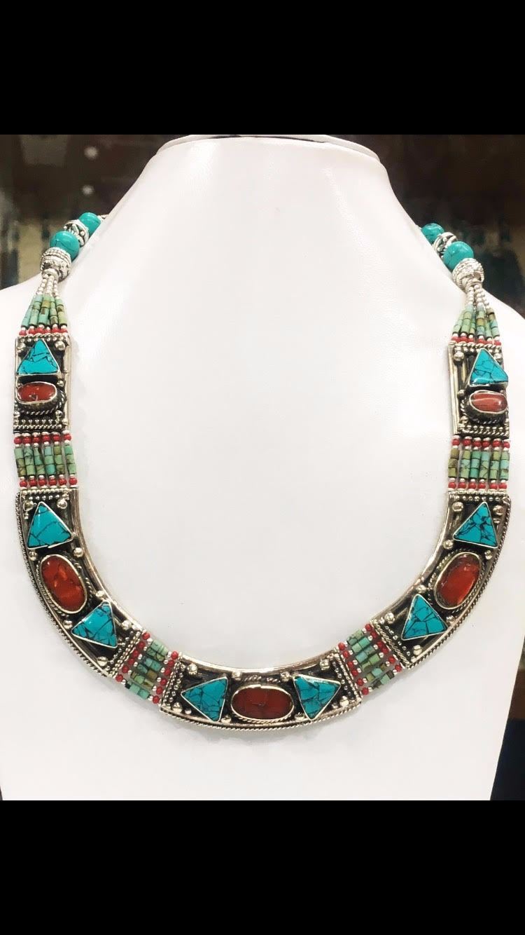 Tibet Natural Stone Hand Made Turquoise, Coral Necklace.......This elegant large Necklace was handcrafted in Tibet, the home of exquisite jewelry craftsmanship. It was skillfully made with large natural Turquoise, each in a deep Tibetan Silver setting. and balance the design perfectly. Turquoise is used virtually worldwide for jewelry making, and is highly prized for its brilliant colors, which vary from mine to mine. The distinctive webbing patterns and variations of color in the stones on this wonderful piece are typical of the natural Turquoise found throughout much of the Himalayan region, where Turquoise has been used in jewelry-making since centuries.”””Note- All stones in this necklace are Natural.....Guranteed....Vintage look but necklace is brand new.