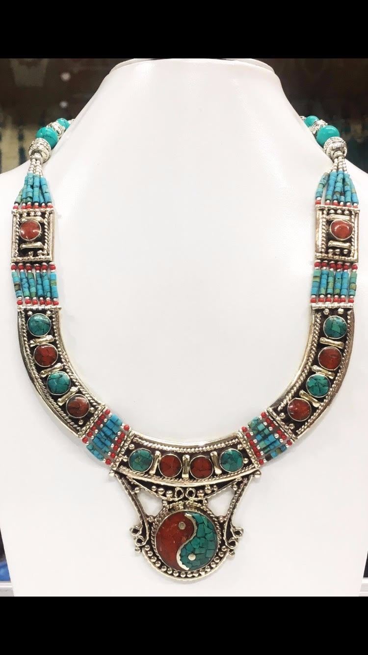 Tibet Natural Stone Hand Made Turquoise, Coral Necklace.......This elegant large Necklace was handcrafted in Tibet, the home of exquisite jewelry craftsmanship. It was skillfully made with large natural Turquoise, each in a deep Tibetan Silver setting. and balance the design perfectly. Turquoise is used virtually worldwide for jewelry making, and is highly prized for its brilliant colors, which vary from mine to mine. The distinctive webbing patterns and variations of color in the stones on this wonderful piece are typical of the natural Turquoise found throughout much of the Himalayan region, where Turquoise has been used in jewelry-making since centuries.”””Note- All stones in this necklace are Natural.....Guranteed....Vintage look but necklace is brand new.