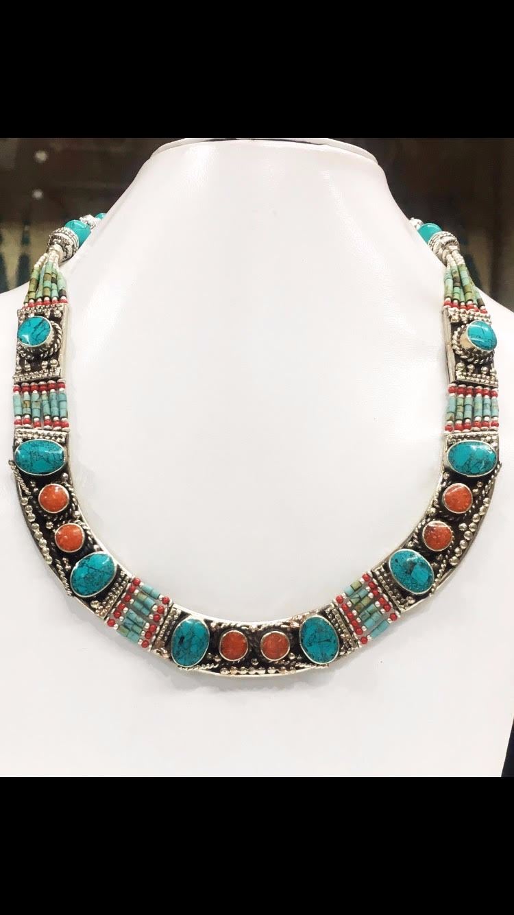 Tibet Natural Stone Hand Made Turquoise, Coral Necklace.......This elegant large Necklace was handcrafted in Tibet, the home of exquisite jewelry craftsmanship. It was skillfully made with large natural Turquoise, each in a deep Tibetan Silver setting. and balance the design perfectly. Turquoise is used virtually worldwide for jewelry making, and is highly prized for its brilliant colors, which vary from mine to mine. The distinctive webbing patterns and variations of color in the stones on this wonderful piece are typical of the natural Turquoise found throughout much of the Himalayan region, where Turquoise has been used in jewelry-making since centuries.”””Note- All stones in this necklace are Natural.....Guranteed....Vintage look but necklace is brand new.