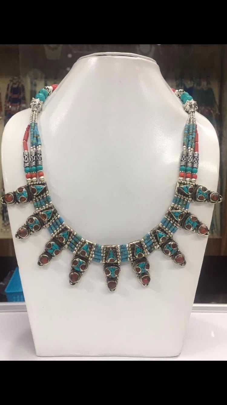 Tibet Natural Stone Hand Made Turquoise, Coral Necklace.......This elegant large Necklace was handcrafted in Tibet, the home of exquisite jewelry craftsmanship. It was skillfully made with large natural Turquoise, each in a deep Tibetan Silver setting. and balance the design perfectly. Turquoise is used virtually worldwide for jewelry making, and is highly prized for its brilliant colors, which vary from mine to mine. The distinctive webbing patterns and variations of color in the stones on this wonderful piece are typical of the natural Turquoise found throughout much of the Himalayan region, where Turquoise has been used in jewelry-making since centuries.”””Note- All stones in this necklace are Natural.....Guranteed....Vintage look but necklace is brand new.