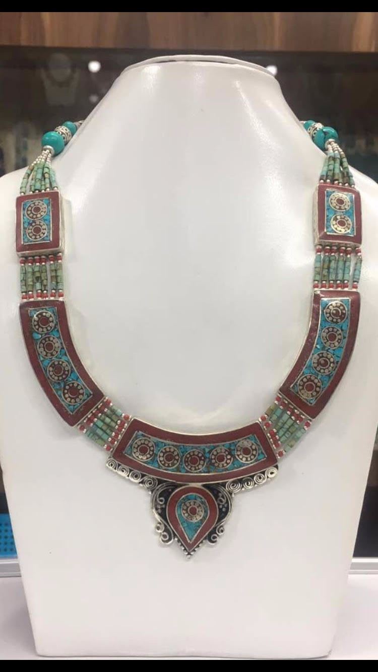 Tibet Natural Stone Hand Made Turquoise, Coral Necklace.......This elegant large Necklace was handcrafted in Tibet, the home of exquisite jewelry craftsmanship. It was skillfully made with large natural Turquoise, each in a deep Tibetan Silver setting. and balance the design perfectly. Turquoise is used virtually worldwide for jewelry making, and is highly prized for its brilliant colors, which vary from mine to mine. The distinctive webbing patterns and variations of color in the stones on this wonderful piece are typical of the natural Turquoise found throughout much of the Himalayan region, where Turquoise has been used in jewelry-making since centuries.”””Note- All stones in this necklace are Natural.....Guranteed....Vintage look but necklace is brand new.
