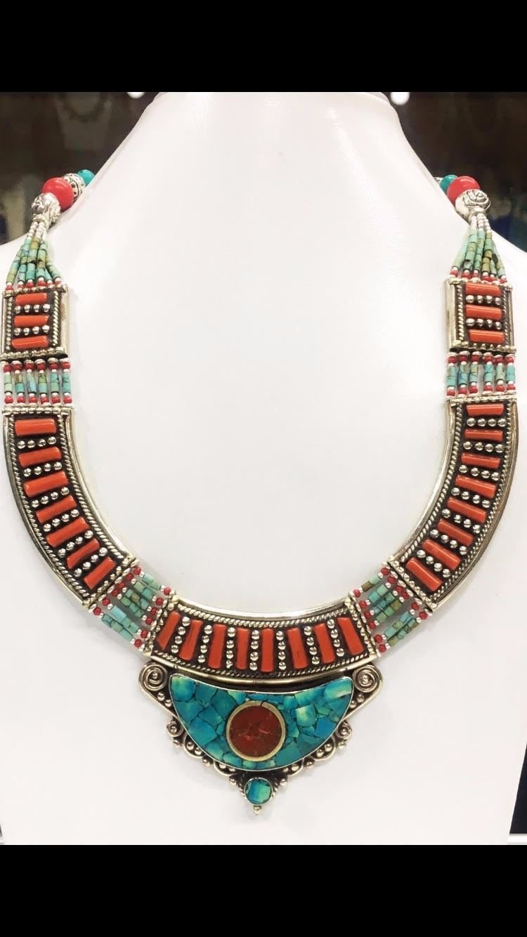 Tibet Natural Stone Hand Made Turquoise, Coral Necklace.......This elegant large Necklace was handcrafted in Tibet, the home of exquisite jewelry craftsmanship. It was skillfully made with large natural Turquoise, each in a deep Tibetan Silver setting. and balance the design perfectly. Turquoise is used virtually worldwide for jewelry making, and is highly prized for its brilliant colors, which vary from mine to mine. The distinctive webbing patterns and variations of color in the stones on this wonderful piece are typical of the natural Turquoise found throughout much of the Himalayan region, where Turquoise has been used in jewelry-making since centuries.”””Note- All stones in this necklace are Natural.....Guranteed....Vintage look but necklace is brand new.