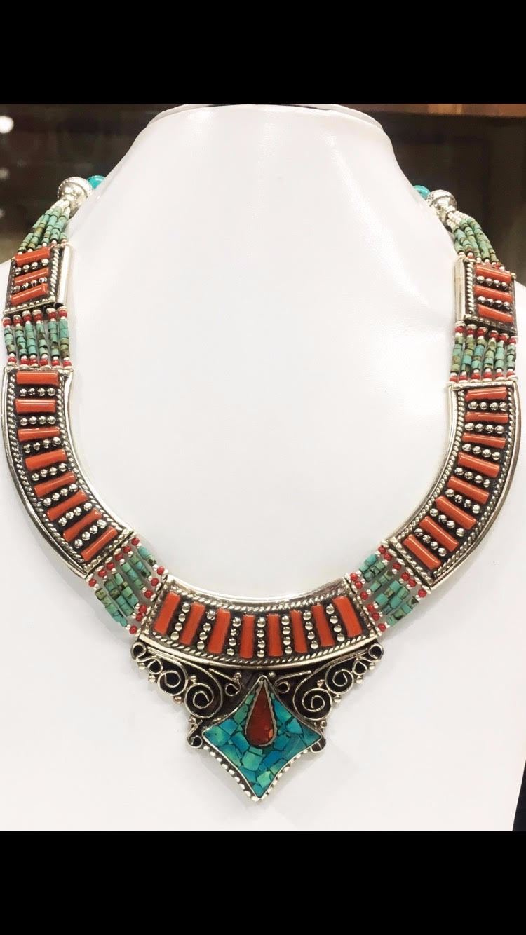Tibet Natural Stone Hand Made Turquoise, Coral Necklace.......This elegant large Necklace was handcrafted in Tibet, the home of exquisite jewelry craftsmanship. It was skillfully made with large natural Turquoise, each in a deep Tibetan Silver setting. and balance the design perfectly. Turquoise is used virtually worldwide for jewelry making, and is highly prized for its brilliant colors, which vary from mine to mine. The distinctive webbing patterns and variations of color in the stones on this wonderful piece are typical of the natural Turquoise found throughout much of the Himalayan region, where Turquoise has been used in jewelry-making since centuries.”””Note- All stones in this necklace are Natural.....Guranteed....Vintage look but necklace is brand new.