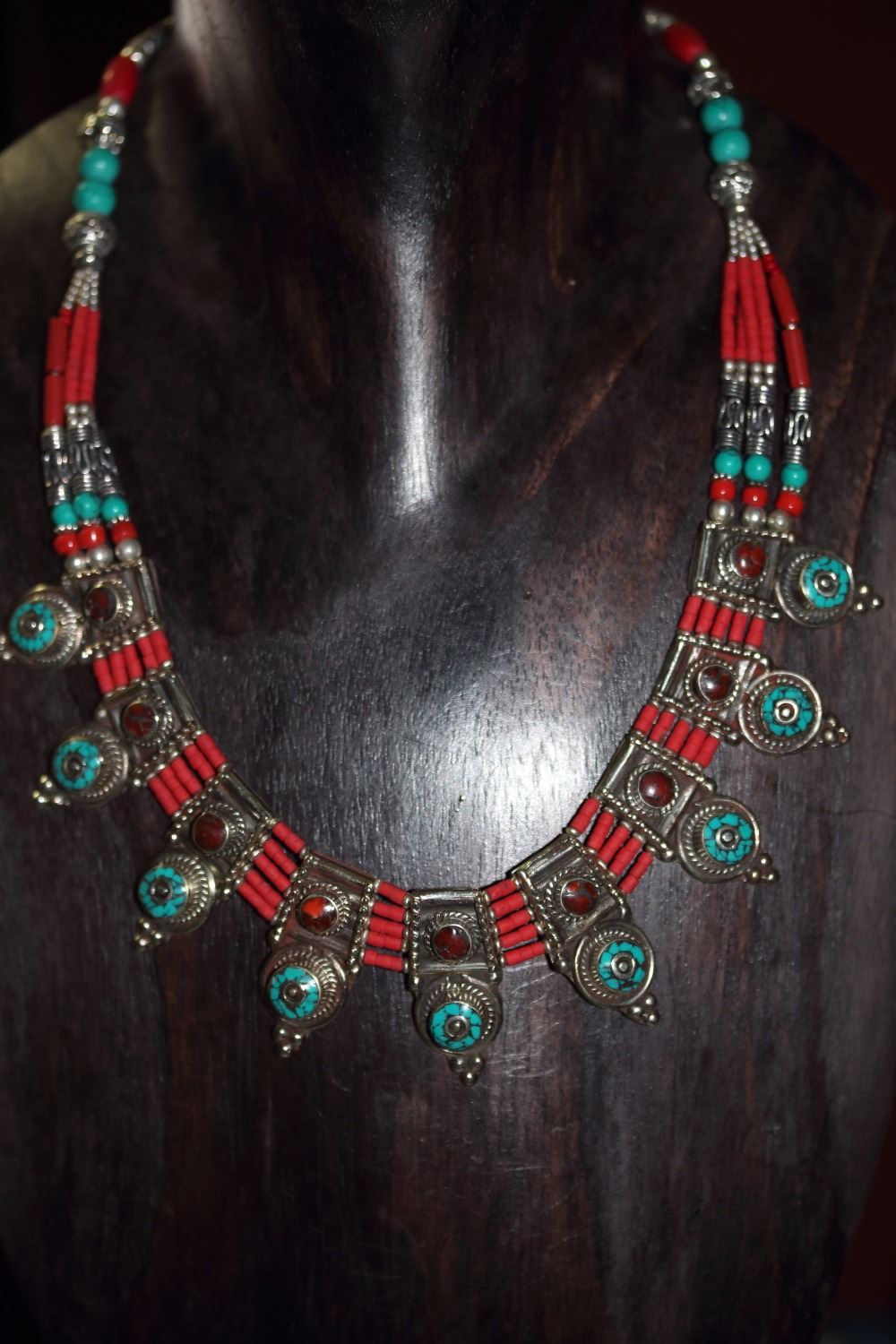 Tibet Natural Stone Hand Made Turquoise, Coral Necklace.......This elegant large Necklace was handcrafted in Tibet, the home of exquisite jewelry craftsmanship. It was skillfully made with large natural Turquoise, each in a deep Tibetan Silver setting. and balance the design perfectly. Turquoise is used virtually worldwide for jewelry making, and is highly prized for its brilliant colors, which vary from mine to mine. The distinctive webbing patterns and variations of color in the stones on this wonderful piece are typical of the natural Turquoise found throughout much of the Himalayan region, where Turquoise has been used in jewelry-making since centuries.”””Note- All stones in this necklace are Natural.....Guranteed....Vintage look but necklace is brand new.
