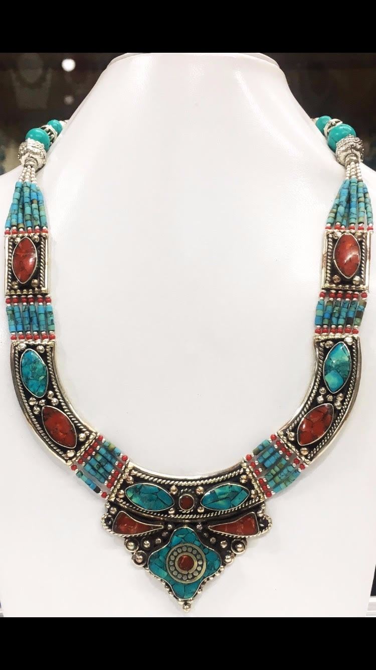 Tibet Natural Stone Hand Made Turquoise, Coral Necklace.......This elegant large Necklace was handcrafted in Tibet, the home of exquisite jewelry craftsmanship. It was skillfully made with large natural Turquoise, each in a deep Tibetan Silver setting. and balance the design perfectly. Turquoise is used virtually worldwide for jewelry making, and is highly prized for its brilliant colors, which vary from mine to mine. The distinctive webbing patterns and variations of color in the stones on this wonderful piece are typical of the natural Turquoise found throughout much of the Himalayan region, where Turquoise has been used in jewelry-making since centuries.”””Note- All stones in this necklace are Natural.....Guranteed....Vintage look but necklace is brand new.
