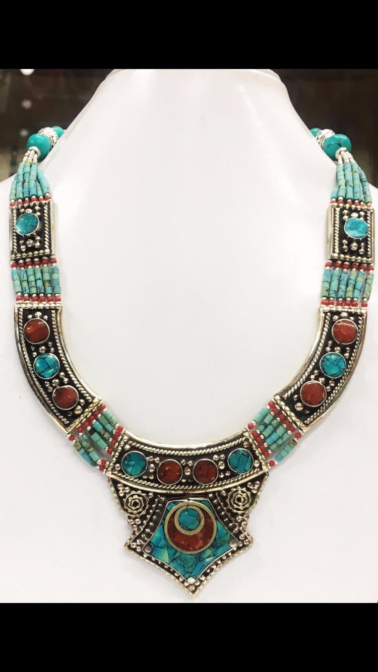 Tibet Natural Stone Hand Made Turquoise, Coral Necklace.......This elegant large Necklace was handcrafted in Tibet, the home of exquisite jewelry craftsmanship. It was skillfully made with large natural Turquoise, each in a deep Tibetan Silver setting. and balance the design perfectly. Turquoise is used virtually worldwide for jewelry making, and is highly prized for its brilliant colors, which vary from mine to mine. The distinctive webbing patterns and variations of color in the stones on this wonderful piece are typical of the natural Turquoise found throughout much of the Himalayan region, where Turquoise has been used in jewelry-making since centuries.”””Note- All stones in this necklace are Natural.....Guranteed....Vintage look but necklace is brand new.