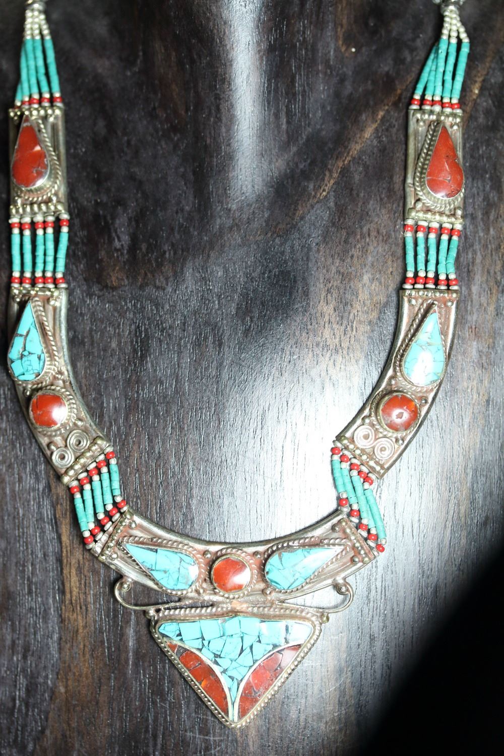 Tibet Natural Stone Hand Made Turquoise Coral Necklace.......This elegant large Necklace was handcrafted in Tibet, the home of exquisite jewelry craftsmanship. It was skillfully made with large natural Turquoise, each in a deep Tibetan Silver setting. and balance the design perfectly. Turquoise is used virtually worldwide for jewelry making, and is highly prized for its brilliant colors, which vary from mine to mine. The distinctive webbing patterns and variations of color in the stones on this wonderful piece are typical of the natural Turquoise found throughout much of the Himalayan region, where Turquoise has been used in jewelry-making since centuries.”””Note- All stones in this necklace are Natural.....Guranteed....Vintage look but necklace is brand new.