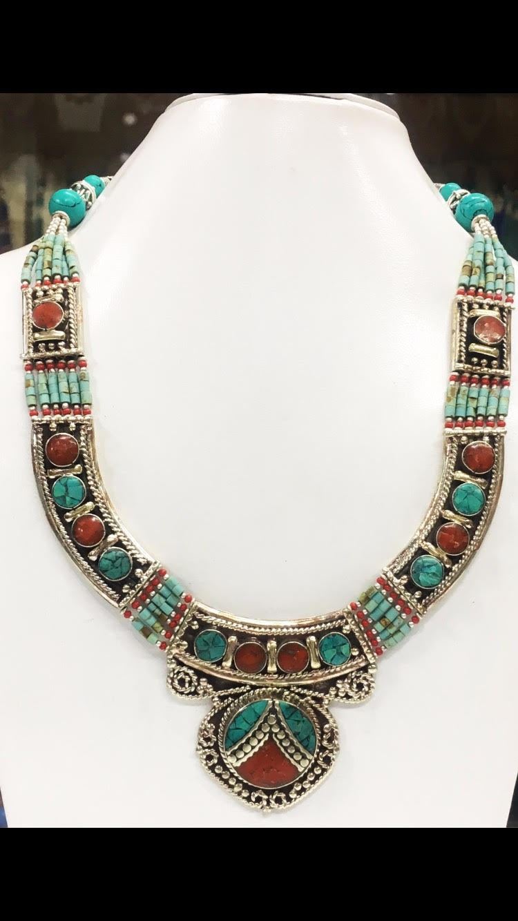Tibet Natural Stone Hand Made Turquoise, Coral Necklace.......This elegant large Necklace was handcrafted in Tibet, the home of exquisite jewelry craftsmanship. It was skillfully made with large natural Turquoise, each in a deep Tibetan Silver setting. and balance the design perfectly. Turquoise is used virtually worldwide for jewelry making, and is highly prized for its brilliant colors, which vary from mine to mine. The distinctive webbing patterns and variations of color in the stones on this wonderful piece are typical of the natural Turquoise found throughout much of the Himalayan region, where Turquoise has been used in jewelry-making since centuries.”””Note- All stones in this necklace are Natural.....Guranateed....Vintage look but necklace is brand new.