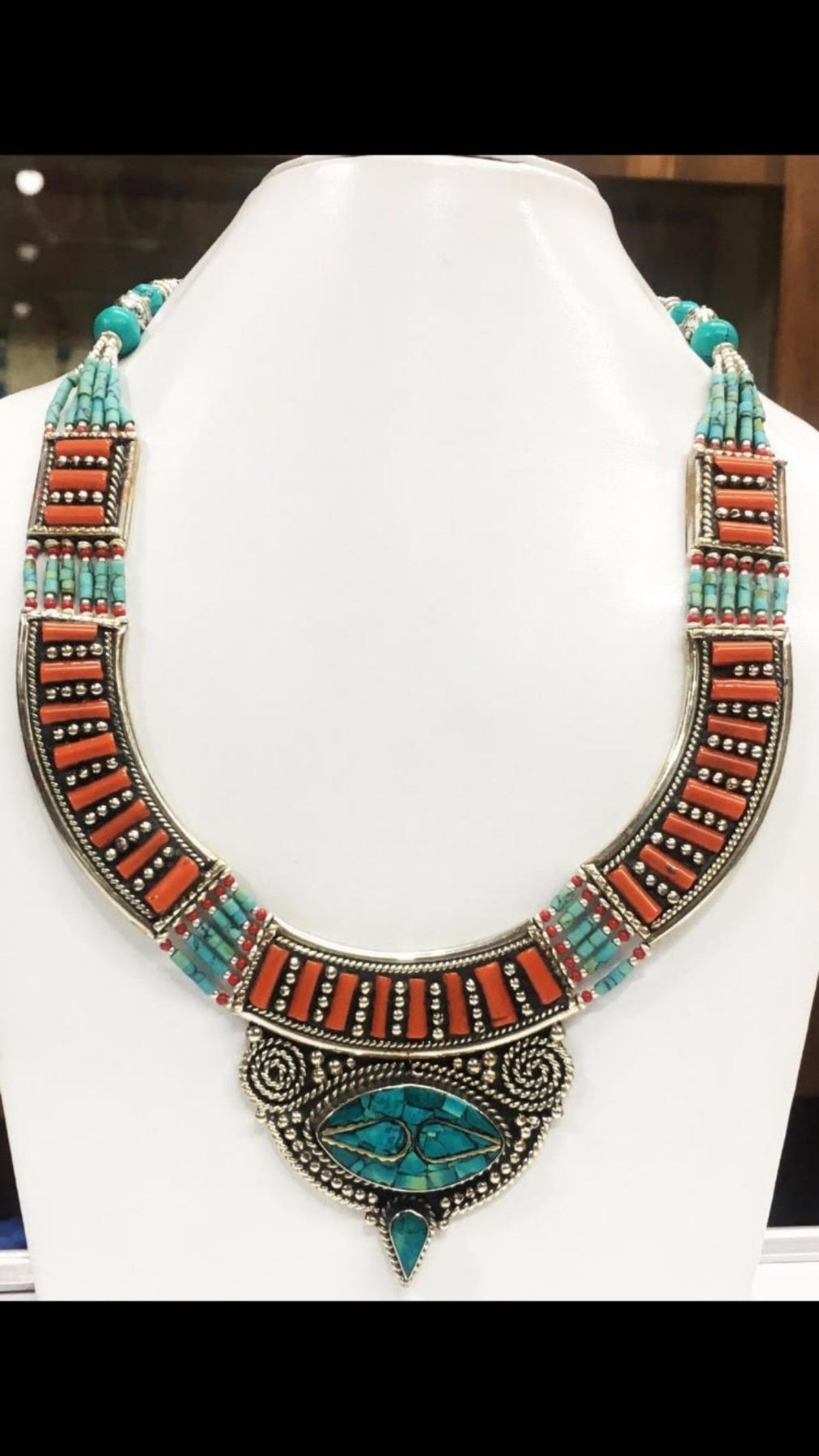 Tibet Natural Stone Hand Made Turquoise, Coral Necklace.......This elegant large Necklace was handcrafted in Tibet, the home of exquisite jewelry craftsmanship. It was skillfully made with large natural Turquoise, each in a deep Tibetan Silver setting. and balance the design perfectly. Turquoise is used virtually worldwide for jewelry making, and is highly prized for its brilliant colors, which vary from mine to mine. The distinctive webbing patterns and variations of color in the stones on this wonderful piece are typical of the natural Turquoise found throughout much of the Himalayan region, where Turquoise has been used in jewelry-making since centuries.”””Note- All stones in this necklace are Natural.....Guranteed....Vintage look but necklace is brand new.