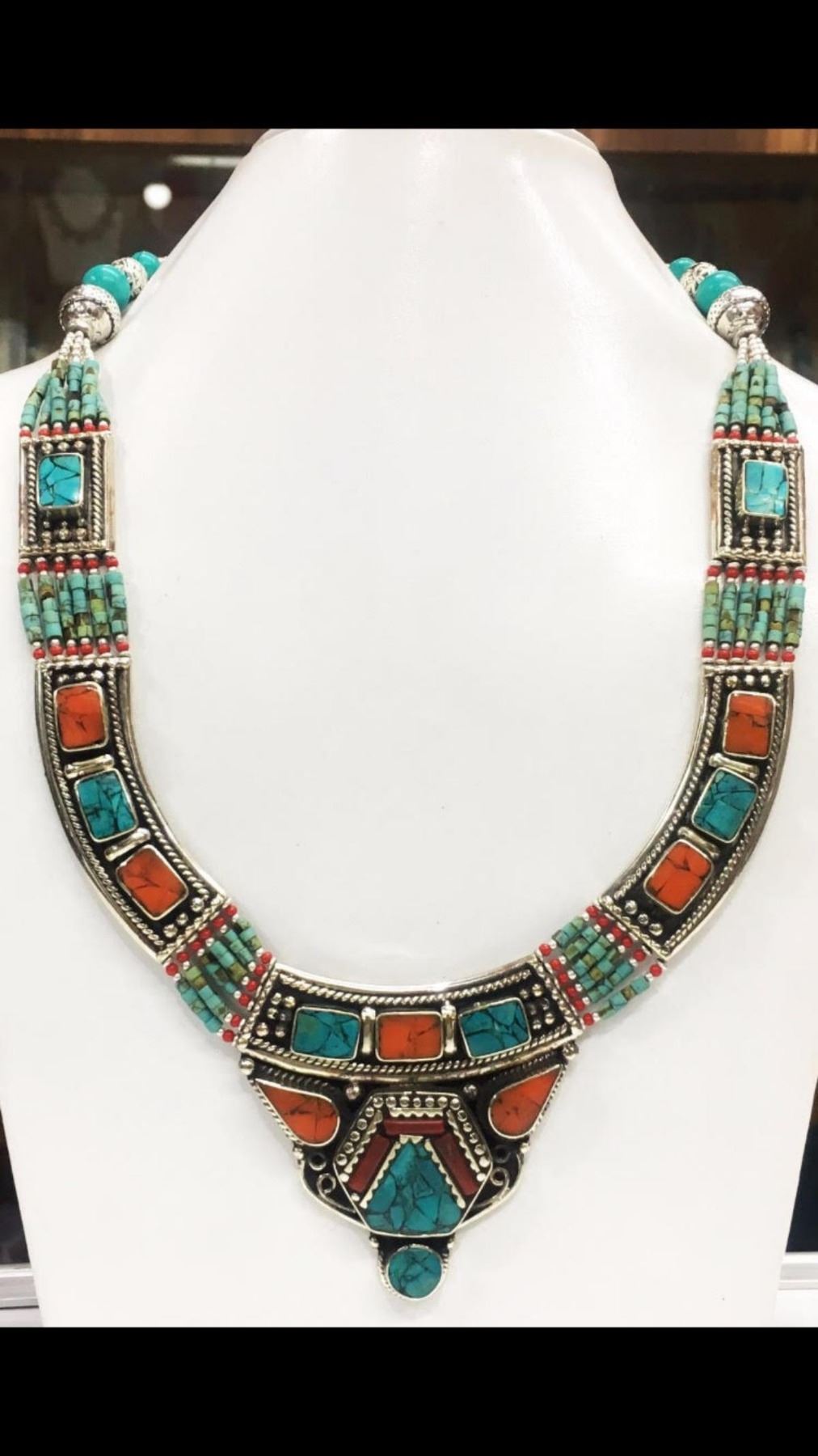 Tibet Natural Stone Hand Made Turquoise, Coral Necklace.......This elegant large Necklace was handcrafted in Tibet, the home of exquisite jewelry craftsmanship. It was skillfully made with large natural Turquoise, each in a deep Tibetan Silver setting. and balance the design perfectly. Turquoise is used virtually worldwide for jewelry making, and is highly prized for its brilliant colors, which vary from mine to mine. The distinctive webbing patterns and variations of color in the stones on this wonderful piece are typical of the natural Turquoise found throughout much of the Himalayan region, where Turquoise has been used in jewelry-making since centuries.”””Note- All stones in this necklace are Natural.....Guranteed....Vintage look but necklace is brand new.