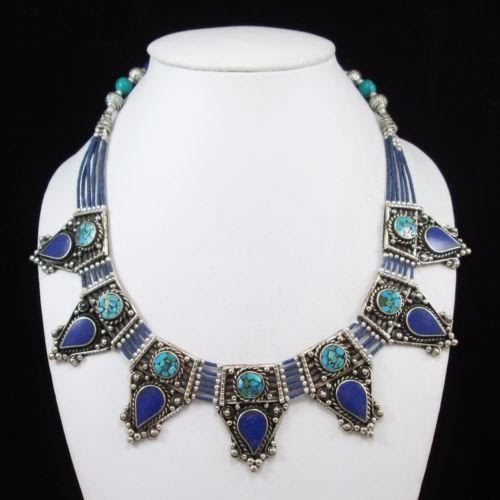Tibet Natural Stone Hand Made Turquoise, Lapis Lazuli Necklace......;This elegant large Necklace was handcrafted in Tibet, the home of exquisite jewelry craftsmanship. It was skillfully made with large natural Turquoise, each in a deep Tibetan Silver setting. and balance the design perfectly. Turquoise is used virtually worldwide for jewelry making, and is highly prized for its brilliant colors, which vary from mine to mine. The distinctive webbing patterns and variations of color in the stones on this wonderful piece are typical of the natural Turquoise found throughout much of the Himalayan region, where Turquoise has been used in jewelry-making since centuries.”””Note- All stones in this necklace are Natural.....Guranteed....Vintage look but necklace is brand new.