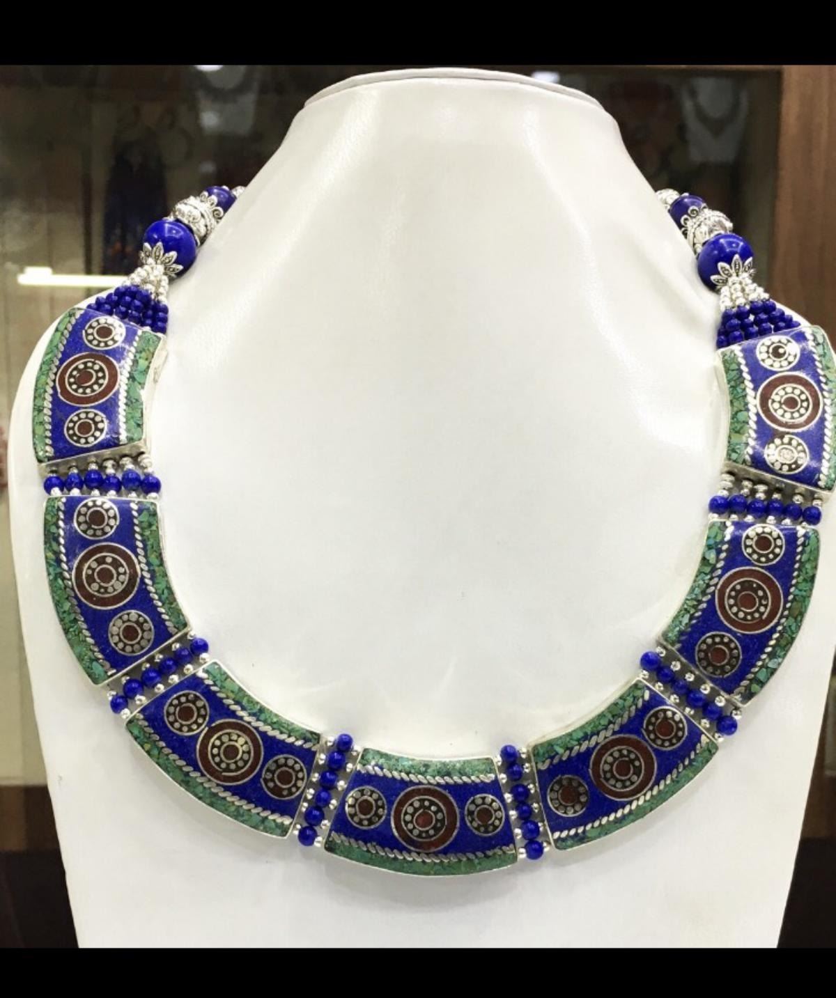 Tibet Natural Stone Hand Made Turquoise & Lapis Lazuli Necklace.......This elegant large Necklace was handcrafted in Tibet, the home of exquisite jewelry craftsmanship. It was skillfully made with large natural Turquoise, each in a deep Tibetan Silver setting. and balance the design perfectly. Turquoise is used virtually worldwide for jewelry making, and is highly prized for its brilliant colors, which vary from mine to mine. The distinctive webbing patterns and variations of color in the stones on this wonderful piece are typical of the natural Turquoise found throughout much of the Himalayan region, where Turquoise has been used in jewelry-making since centuries.”””Note- All stones in this necklace are Natural.....Guaranteed....Vintage look but necklace is brand new.