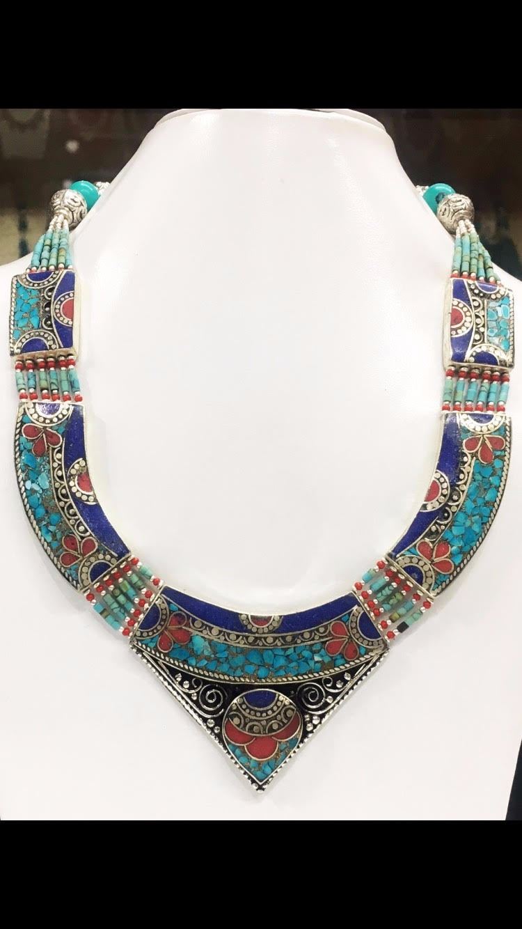 Tibet Natural Stone Hand Made Turquoise, Coral Necklace.......This elegant large Necklace was handcrafted in Tibet, the home of exquisite jewelry craftsmanship. It was skillfully made with large natural Turquoise, each in a deep Tibetan Silver setting. and balance the design perfectly. Turquoise is used virtually worldwide for jewelry making, and is highly prized for its brilliant colors, which vary from mine to mine. The distinctive webbing patterns and variations of color in the stones on this wonderful piece are typical of the natural Turquoise found throughout much of the Himalayan region, where Turquoise has been used in jewelry-making since centuries.”””Note- All stones in this necklace are Natural.....Guranteed....Vintage look but necklace is brand new.
