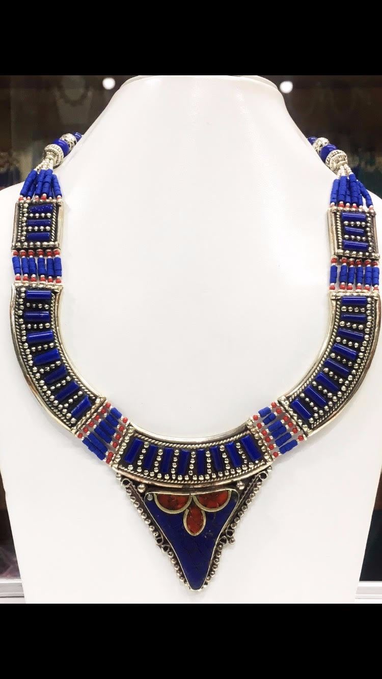 Tibet Natural Stone Hand Made Lapiz Lazuli & Coral Necklace ......;This elegant large Necklace was handcrafted in Tibet, the home of exquisite jewelry craftsmanship. It was skillfully made with large natural lapiz Lazuli & coral, each in a deep Tibetan Silver setting. and balance the design perfectly.”””Note- All stones in this necklace are Natural.....guaranteed....Vintage look but necklace is brand new.
