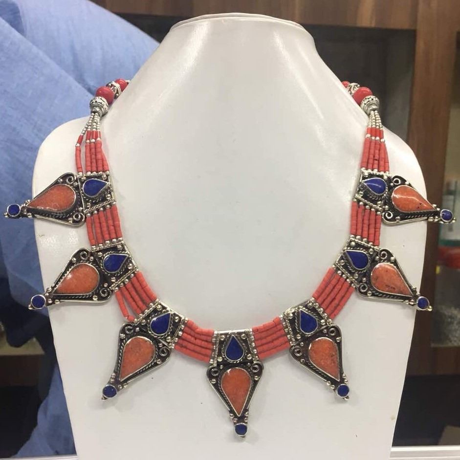 Tibet Natural Stone Hand Made lapiz lazuli, Coral Necklace ......;This elegant large Necklace was handcrafted in Tibet, the home of exquisite jewelry craftsmanship. It was skillfully made with large natural lapiz lazuli, each in a deep Tibetan Silver setting. and balance the design perfectly. ”””Note- All stones in this necklace are Natural.....guaranteed....Vintage look but necklace is brand new.