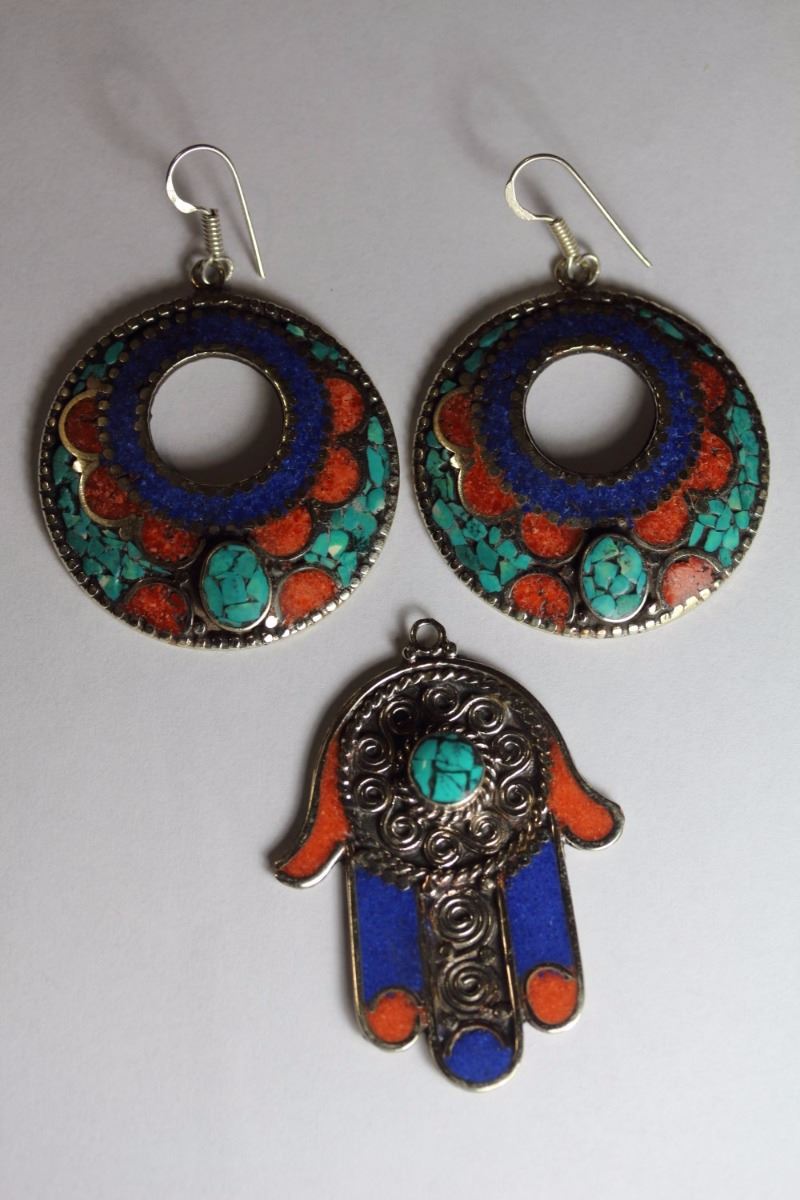Tibet Hand Made Natural Turquoise, Coral, Lapis Lazuli Earings & Pendant....This elegant earrings & Pendant handcrafted in Tibet, the home of exquisite jewelry craftsmanship. It was skillfully made with natural Turquoise, each in a deep Tibetan Silver setting. and balance the design perfectly. Turquoise is used virtually worldwide for jewelry making, and is highly prized for its brilliant colors, which vary from mine to mine. The distinctive webbing patterns and variations of color in the stones on this wonderful piece are typical of the natural Turquoise found throughout much of the Himalayan region, where Turquoise has been used in jewelry-making since centuries.”””Note- All stones in this necklace are Natural.....Guranteed....Vintage look but both items are brand new.Measurements.....Earrings diameter 41 mm; Pendant 54 x 35 mm