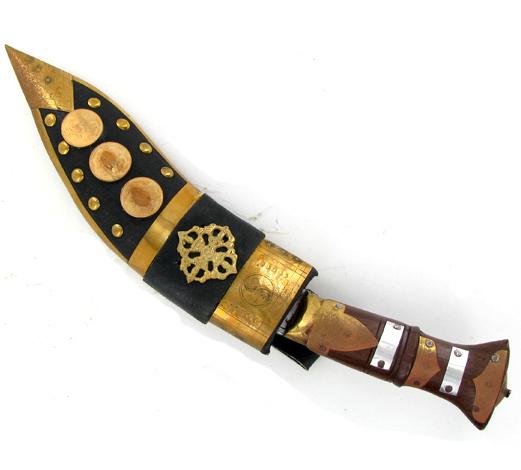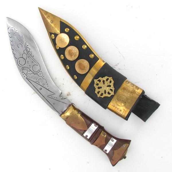Excellent Tibet piece with inlaid bone on handle and gilded scarab ornaments; 12"