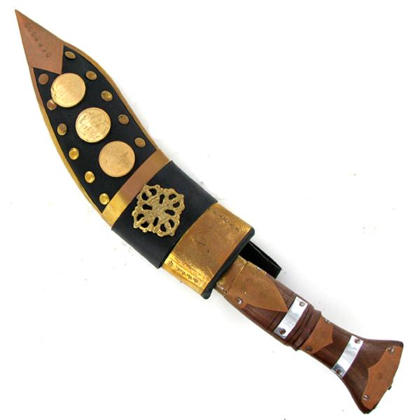 Excellent Tibet piece with inlaid bone on handle and gilded scarab ornaments; 12"