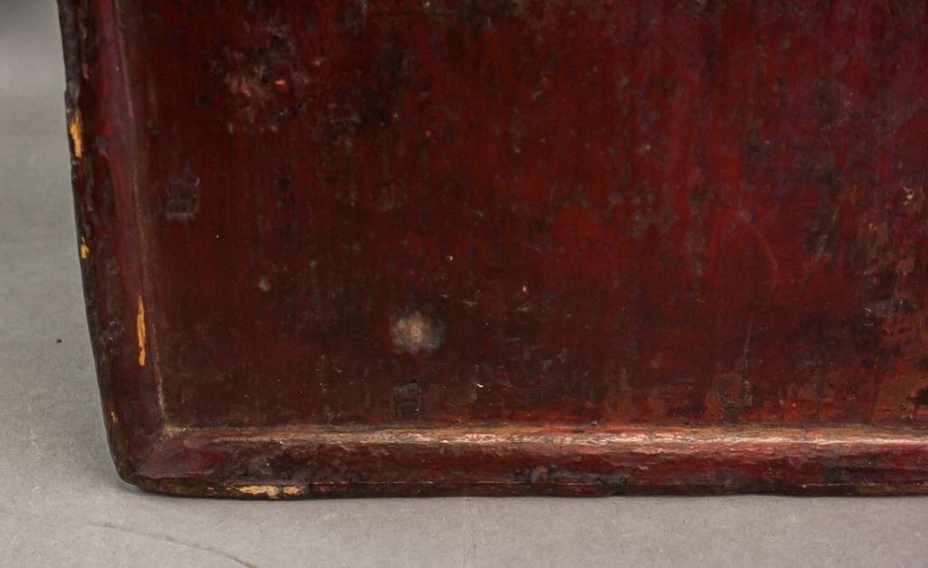Tibetan altar table. Of dark wood, painted. With legs on three sides. Some general wear and tear. 30 x 63 cm, 3314 grams.