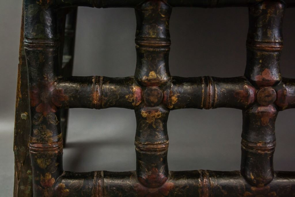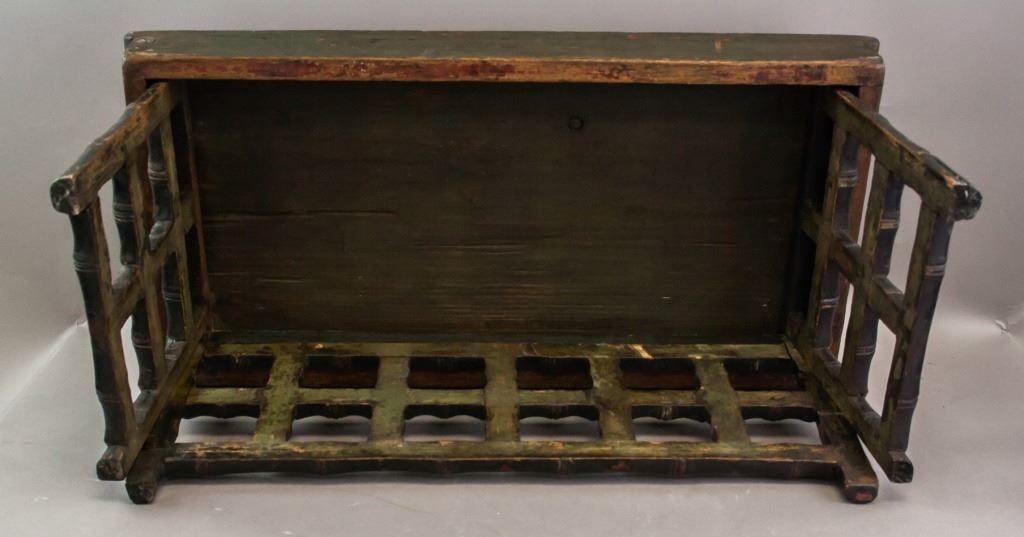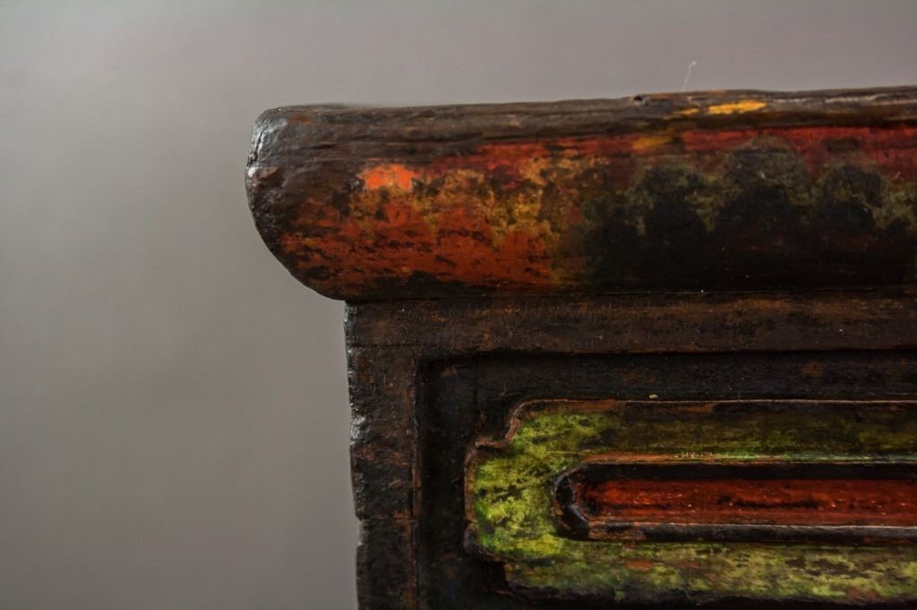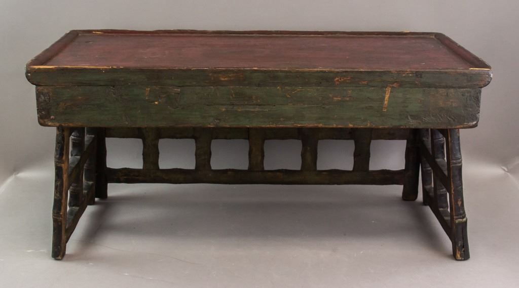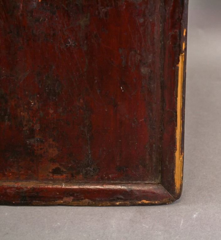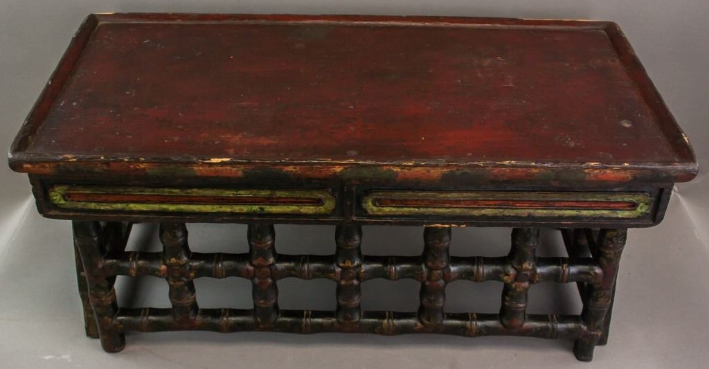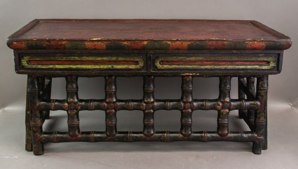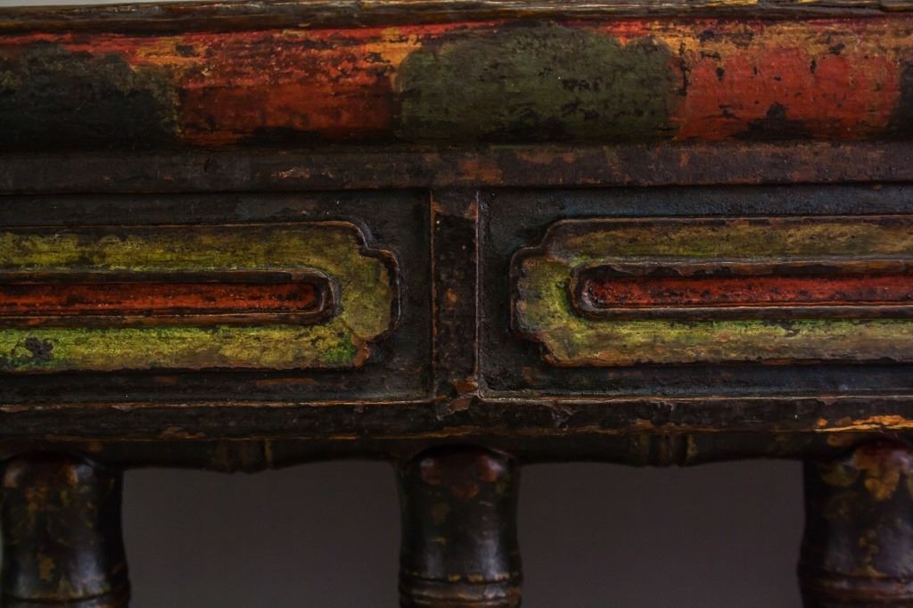 Tibetan altar table. Of dark wood, painted. With legs on three sides. Some general wear and tear. 30 x 63 cm, 3314 grams.