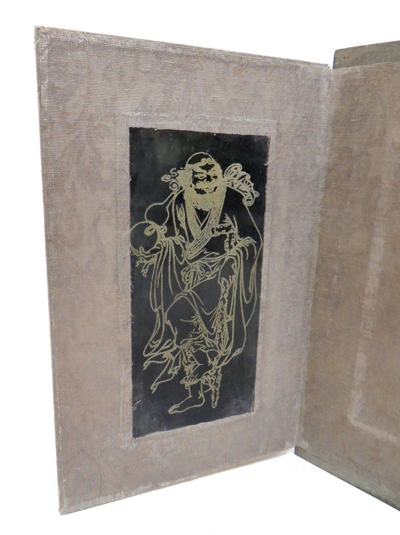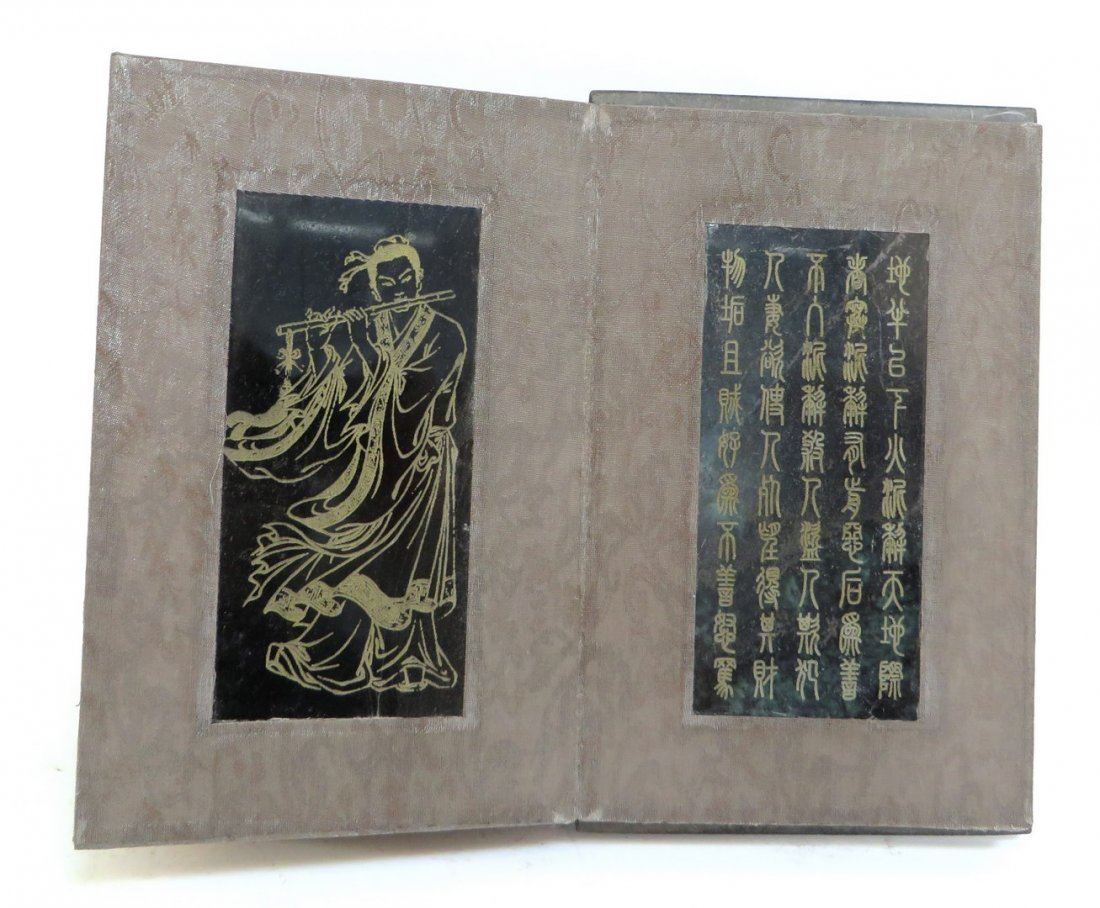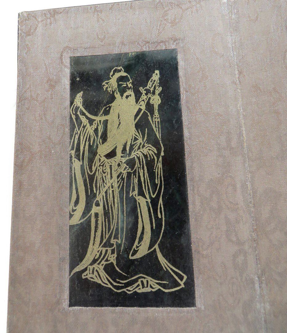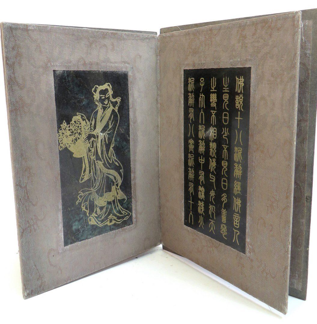 Tibetan book with jade pages, eight in all. The cover is carved with a Buddha and calligraphy, dark spinach jade pages with taupe embroidered mats. Calligraphy pages alternate with incised figures. The first page has a dancing male figure, the back page has Quan Yin mark and a lotus. No Reserve!