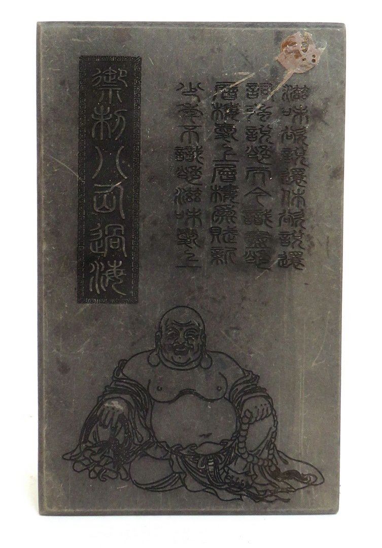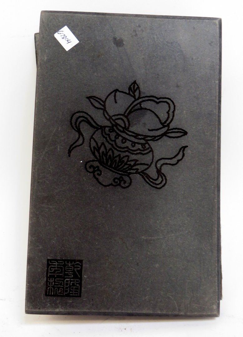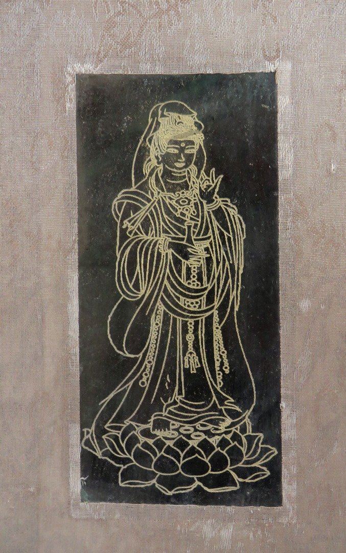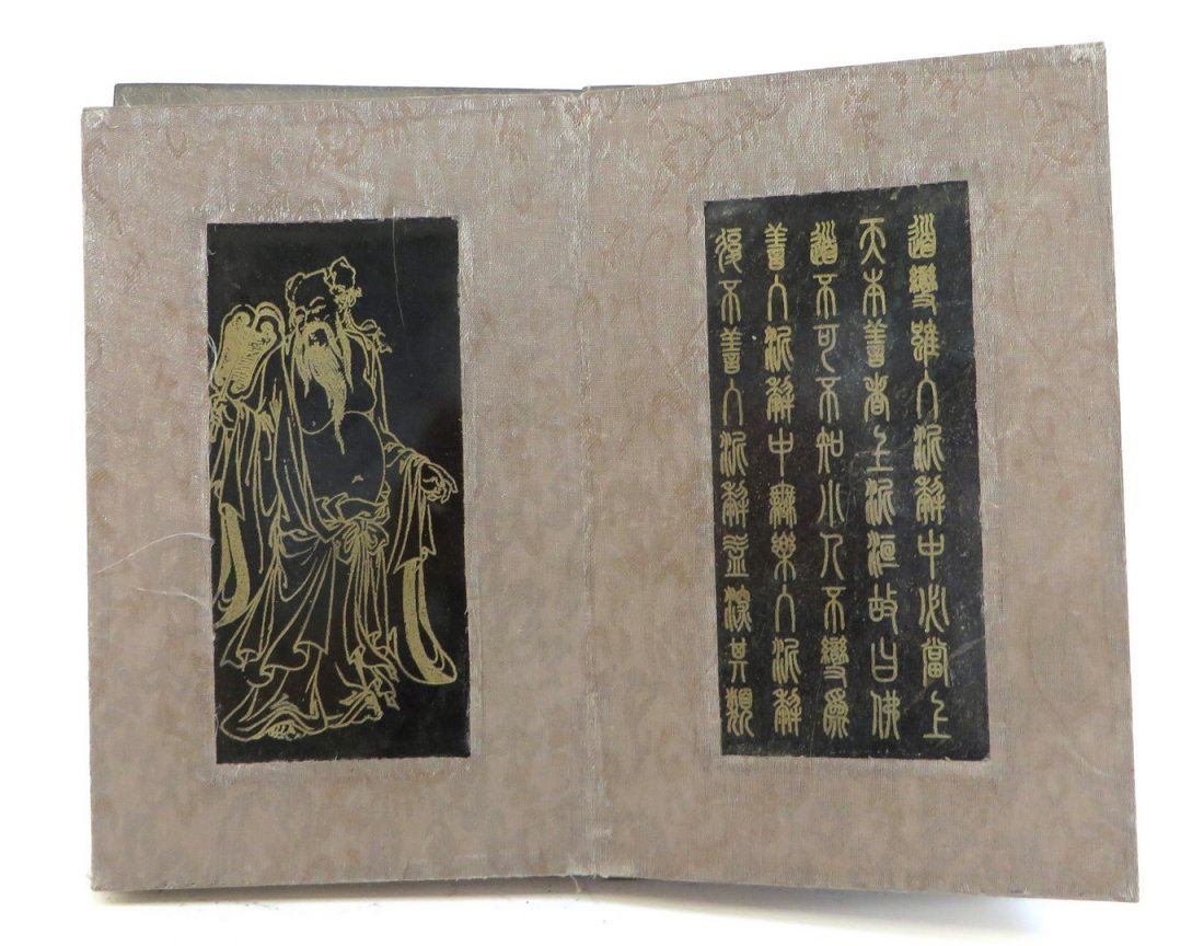 Tibetan book with jade pages, eight in all. The cover is carved with a Buddha and calligraphy, dark spinach jade pages with taupe embroidered mats. Calligraphy pages alternate with incised figures. The first page has a dancing male figure, the back page has Quan Yin mark and a lotus. No Reserve!
