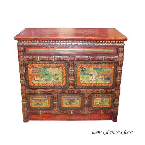 This Tibetan cabinet is hand-painted by an artist about the story of a person's road to become a Buddha. Each picture has a precise drawing of people, scenery and animals. It is a four-side painting cabinet table which can be a center piece of the room with a decorative and storage function. </p>