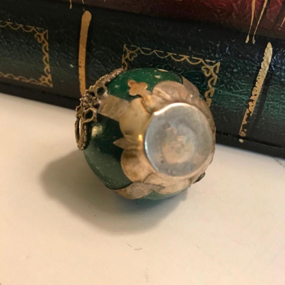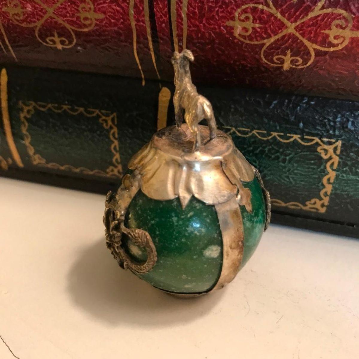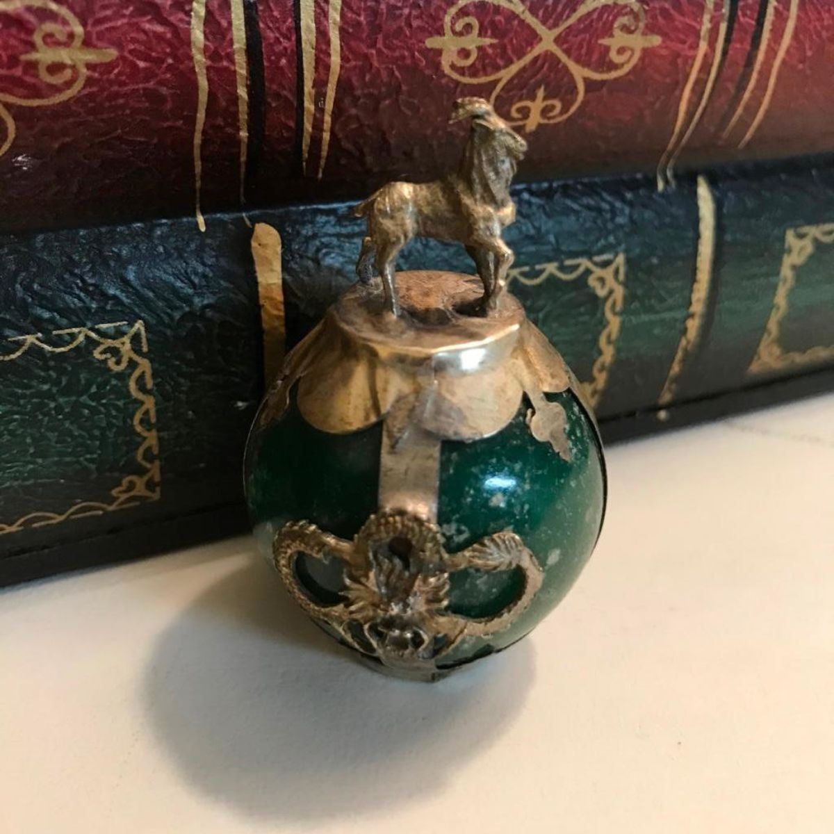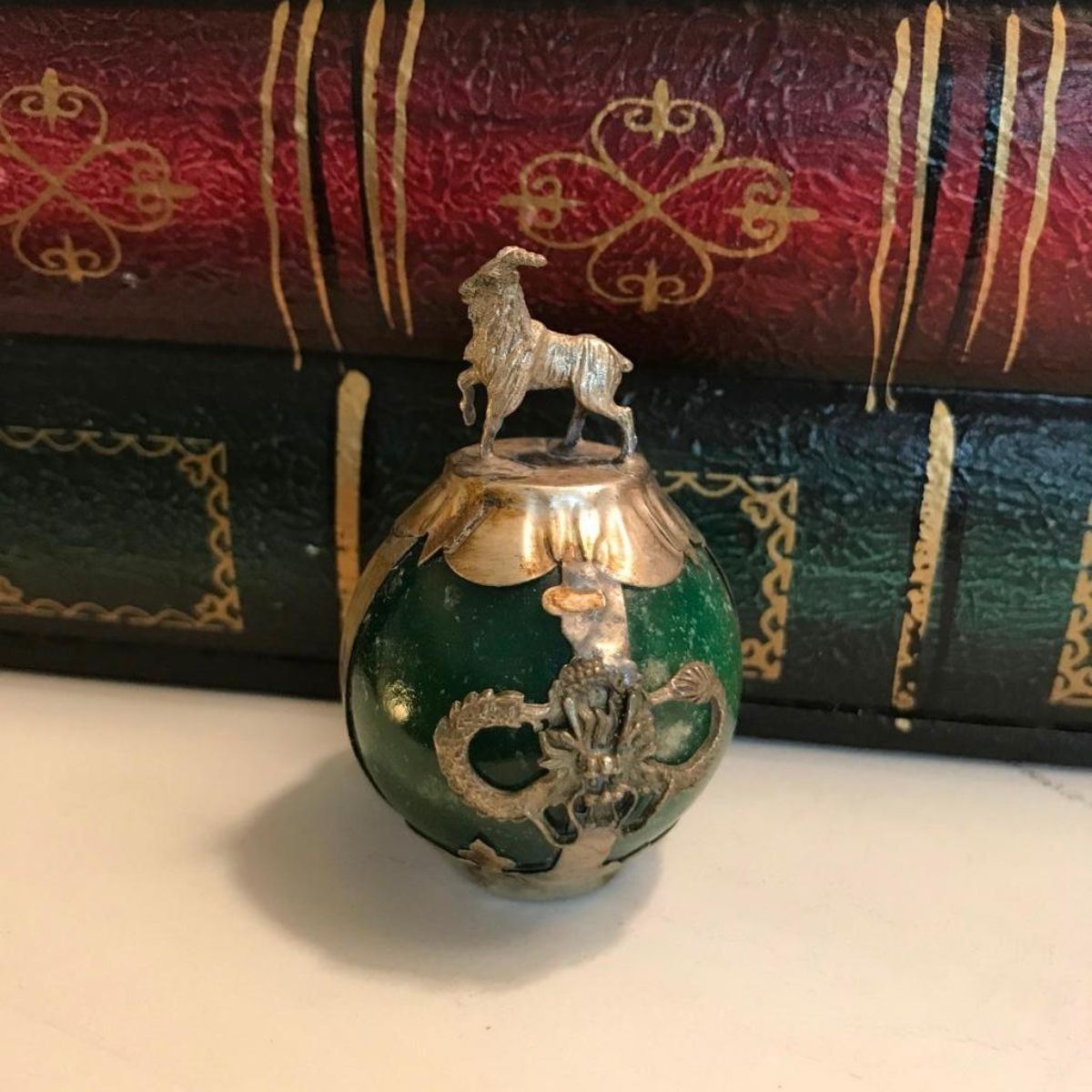 Old Tibetan handwork silver, dragon motif with tiny goat atop a green jade-colored round stone ball. Capricorn zodiac totem statue. 2 1/4" H X 1 1/2" D.