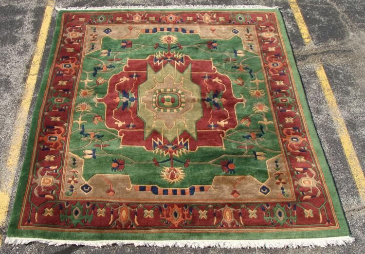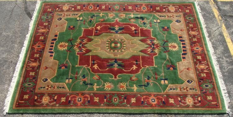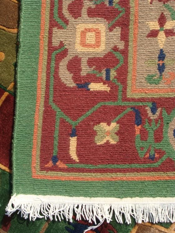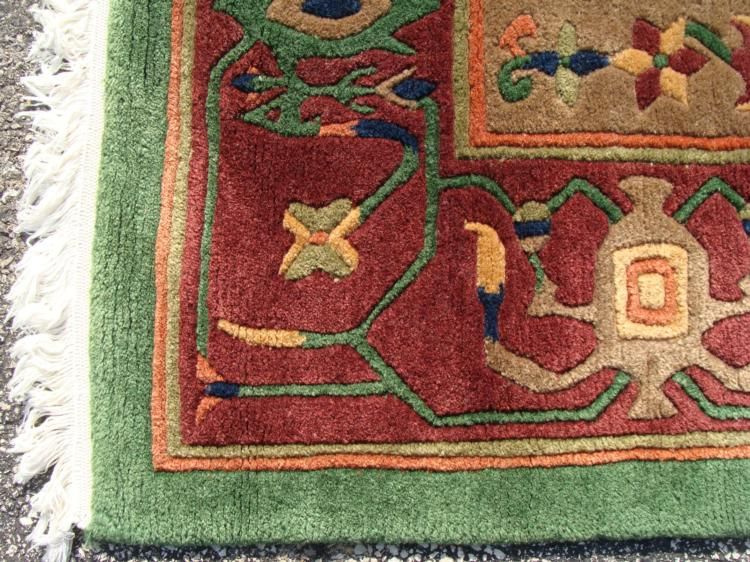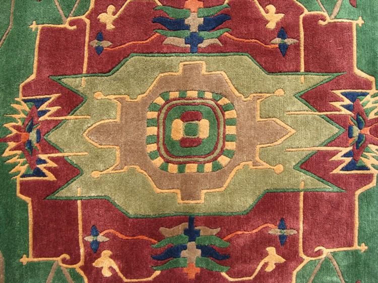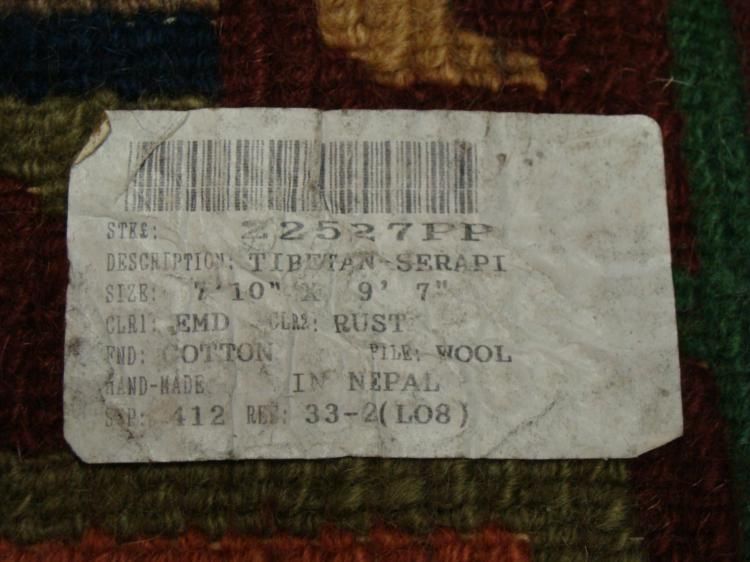 This is a large Tibetan Serapi wool rug with bold decorative pattern. It was hand made in Nepal. The dominant colors are rust red, two shades of green, and golden yellow, along with dark blue, and orange, and beige. The wool pile is heavy weave, and of very high quality. The short ends have white cotton fringe. Its condition is excellent, with a soft sheen. The size measures about 115 x 96 inches. * This will make an attractive floor covering for any room in your home.