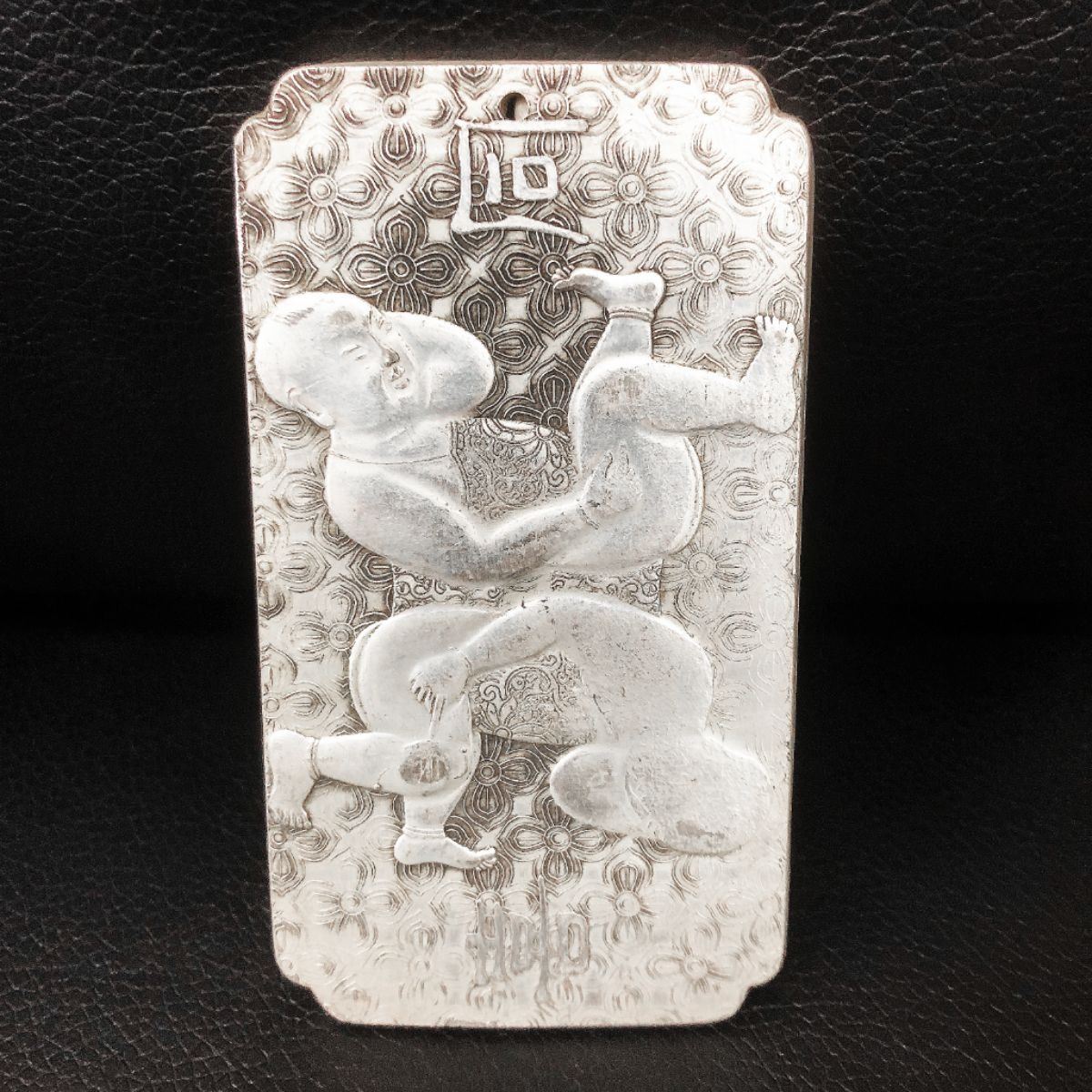 A Tibetan Silver Bullion With Simese Twin Figure. The Bullion Is Mark On The Back In Chinese. Weighing 139g.