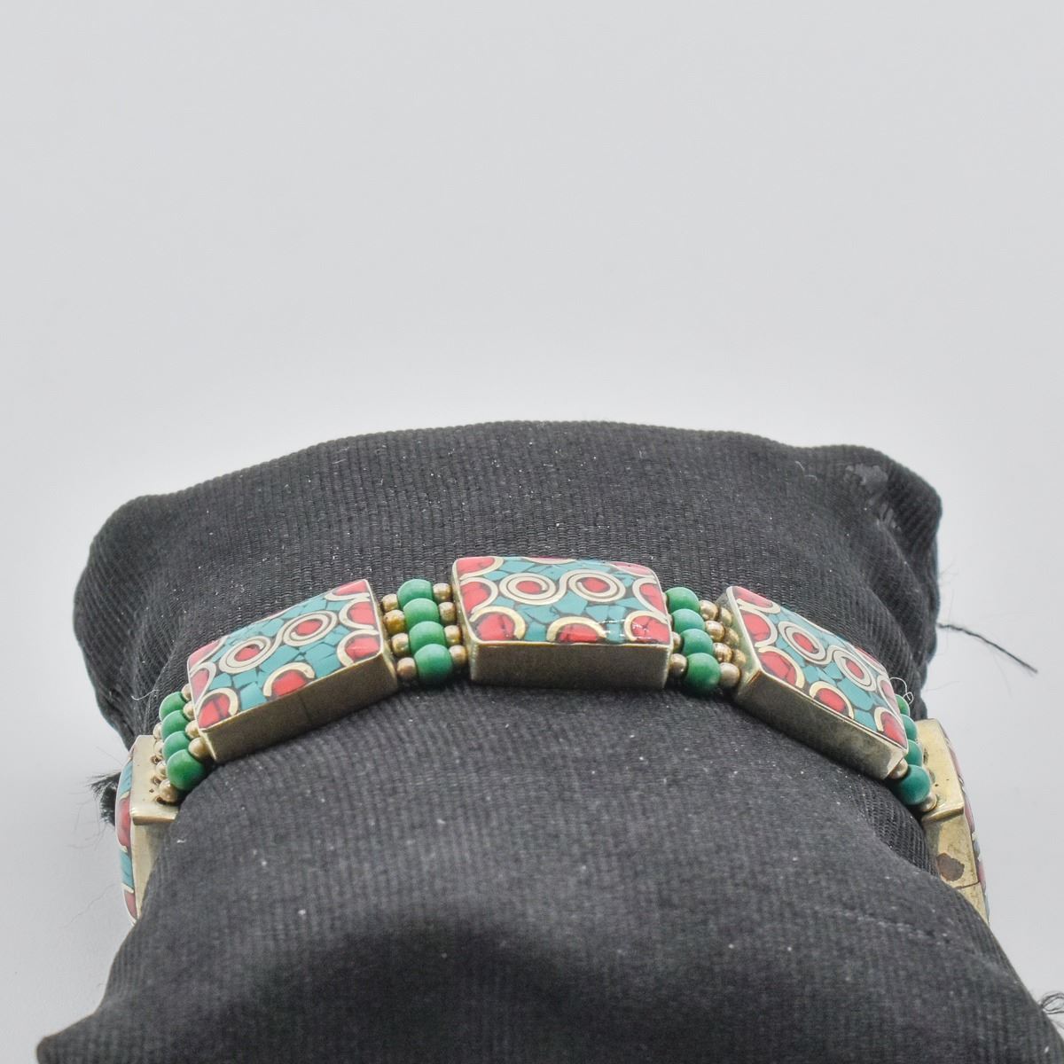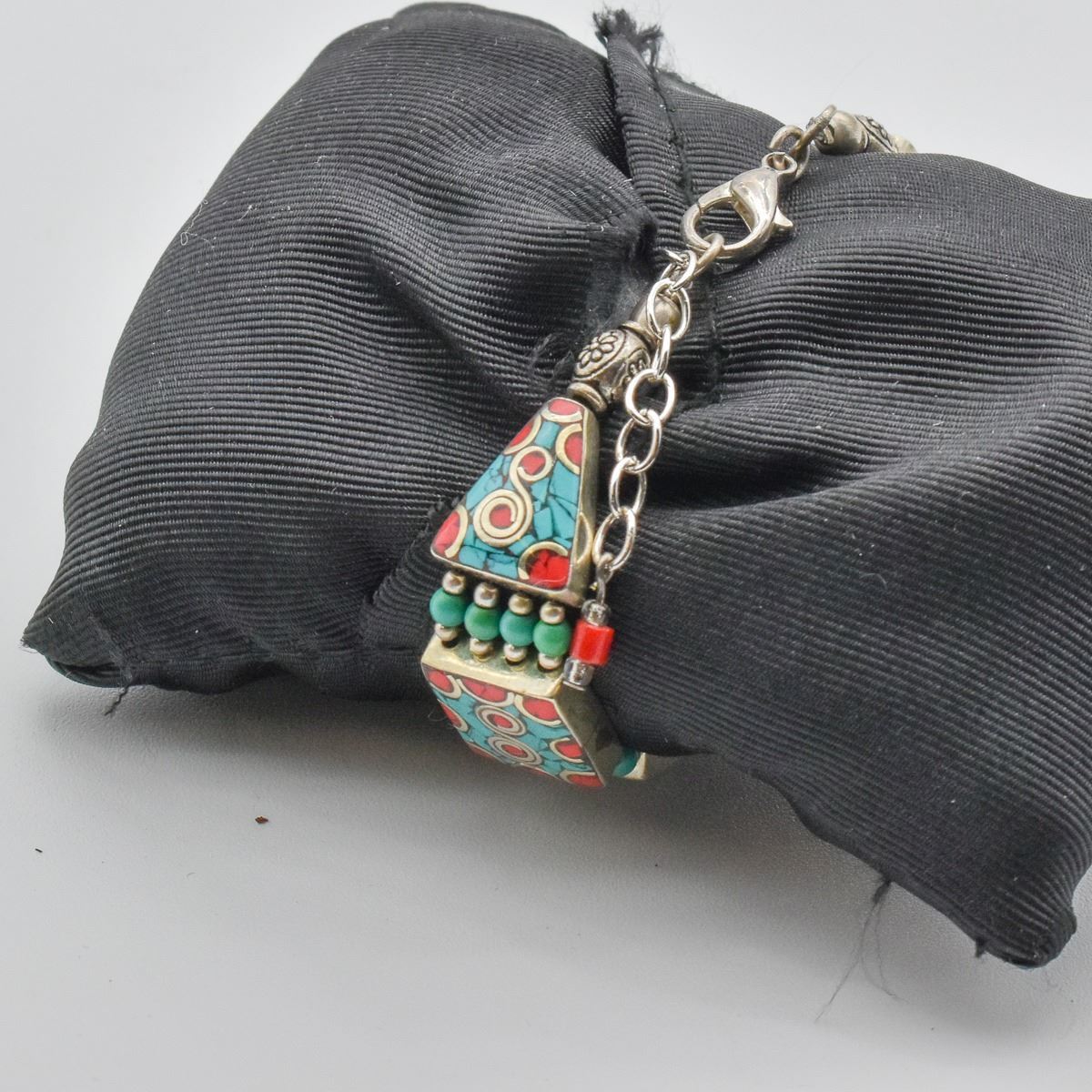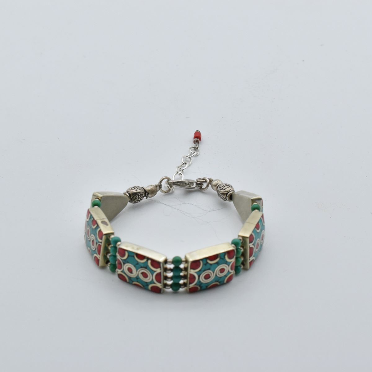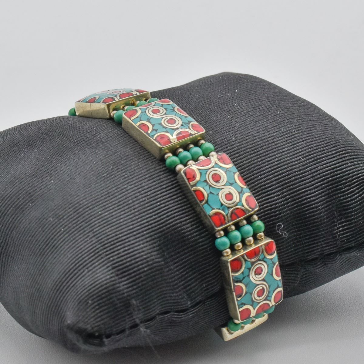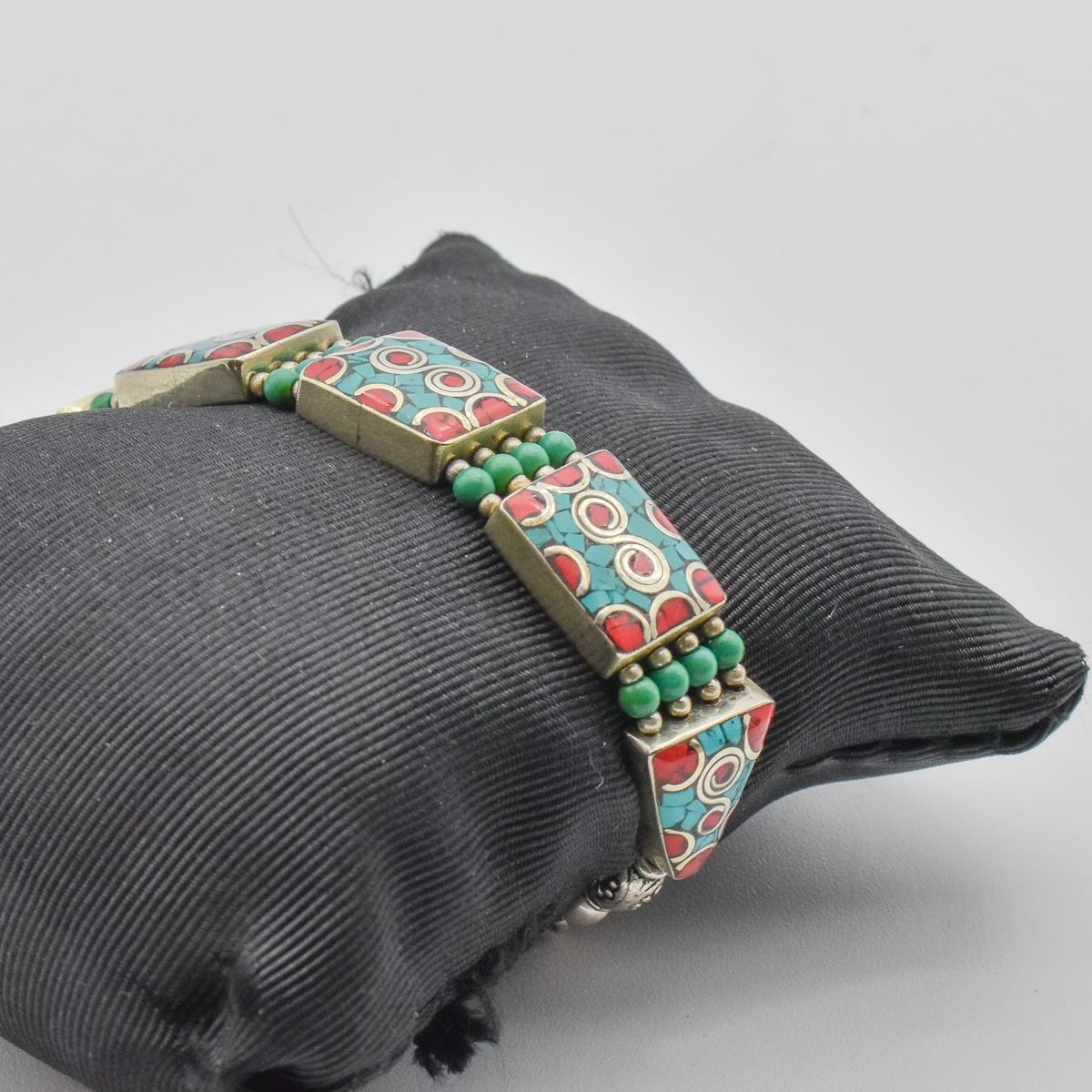Tibetan Silver Turquoise and Coral Link Bracelet, measures .5''W x 8''L end to end, adjustable length